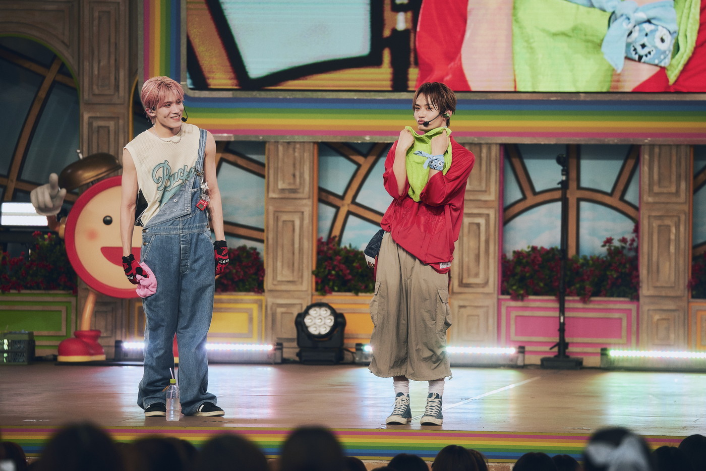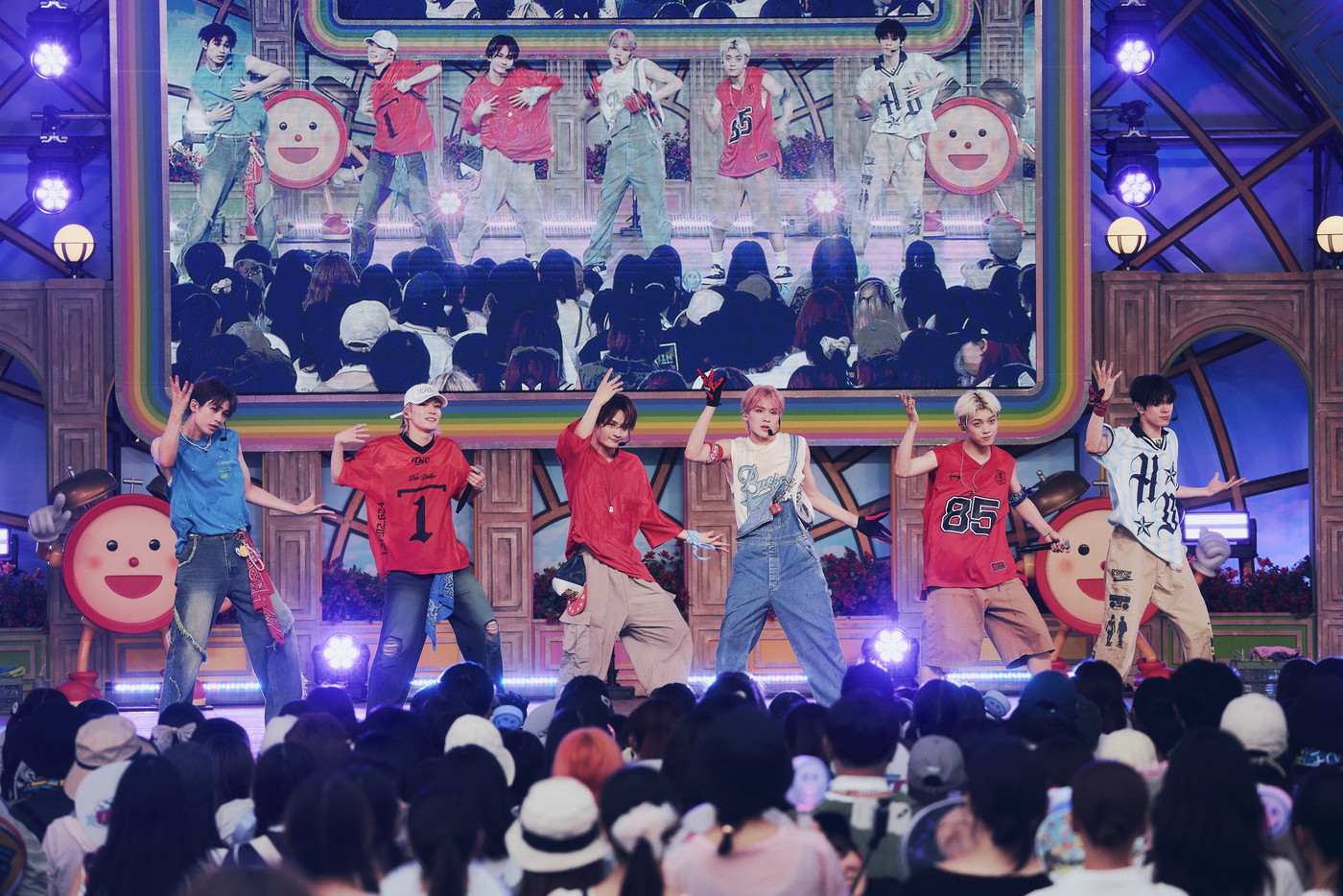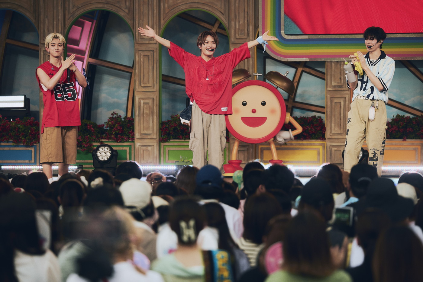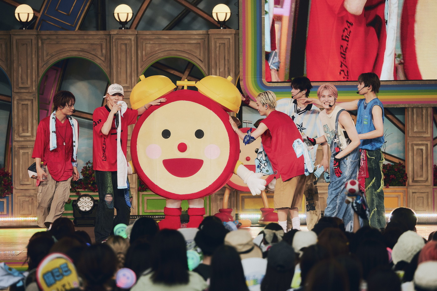 谷口太一がめざましくんをアテンドしながら、他のメンバーもじゃれ合いながらパフォーマンスを披露。名残惜しいのか、最後に大久保は何度も「もう一回!」と叫びサビを歌い、会場はさらにピースフルな空間に。全力を出し切ったメンバーはとてもうれしそうに、少し名残惜しそうにステージをあとにした。