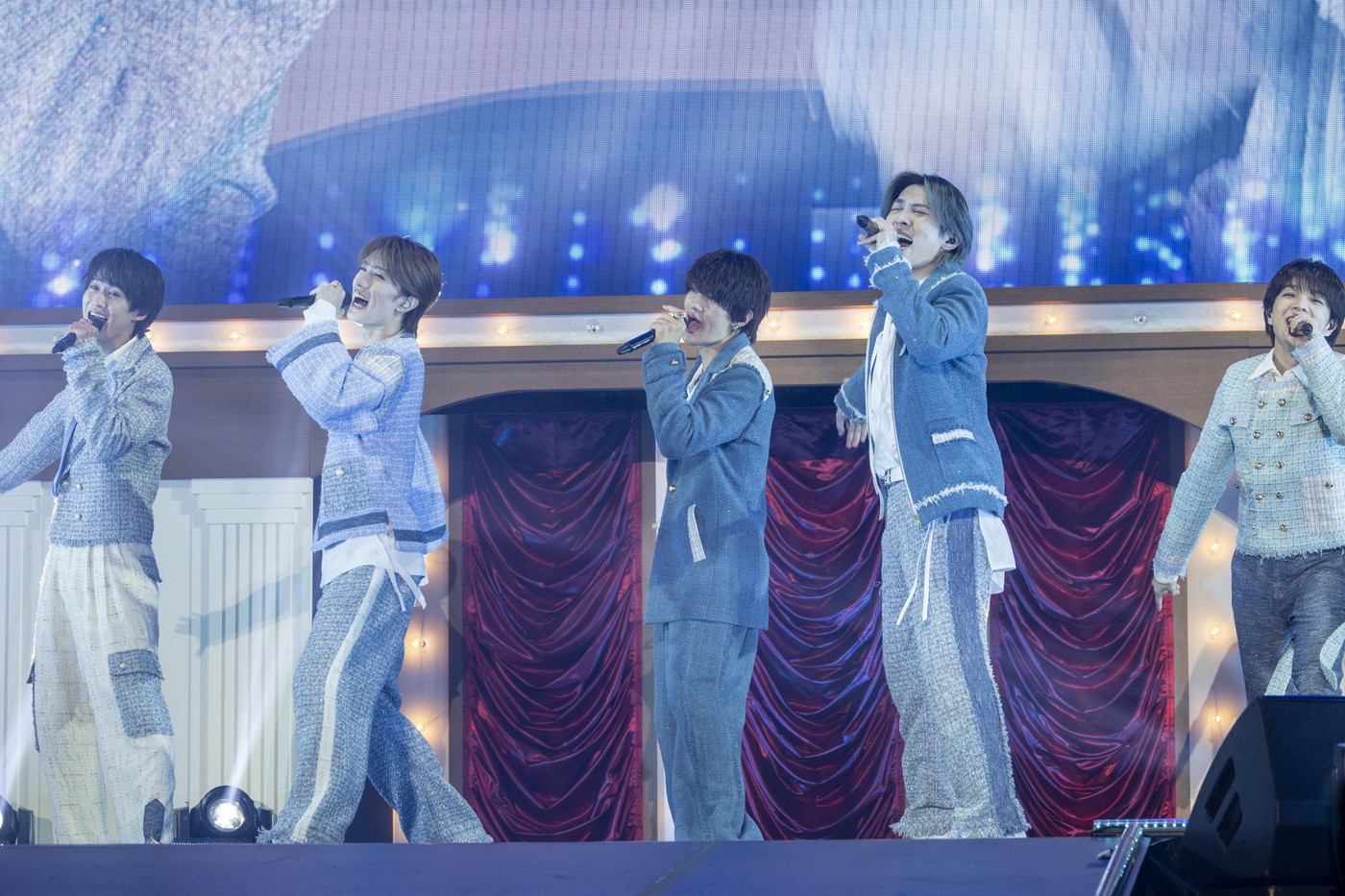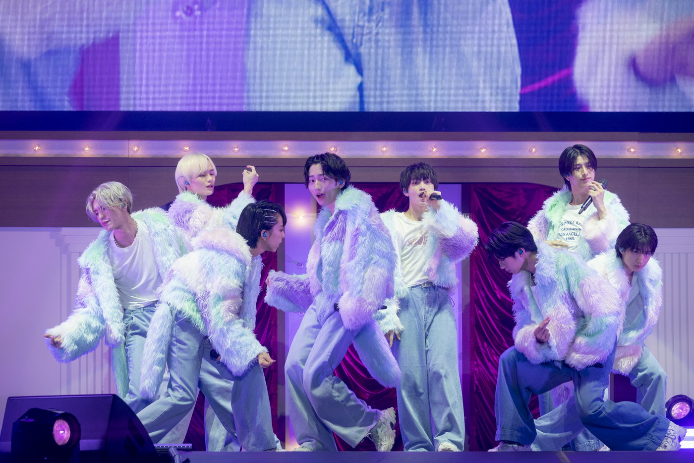 SUPER★DRAGONは、田中洸希の主演ドラマ『シュガードッグライフ』の主題歌「Sweets」をセンターステージからドロップ。両頬を指さしてニコリと笑む田中の決めポーズからキュートに跳ね、ボーカルの池田彪馬は指先からキスを、古川毅はウインクを飛ばして、厳ついパブリックイメージを塗り替える一方、緻密なダンスブレイクも挟んでスキルの高さを見せつけるのがニクい。M!LKは大人への階段を上り、全力で生きるかけがえのない瞬間を“青”に例えた「ブルーシャワー」という、クルーズがテーマのライブにぴったりの最新シングルをセレクト。爽快な音に軽やかなダンスで彼ららしいキラキラ感を惜しみなく溢れさせながら、5人で重ねる想いのこもったボーカルで、切なさ交じりの希望をドラマティックに全力で歌い上げていった。