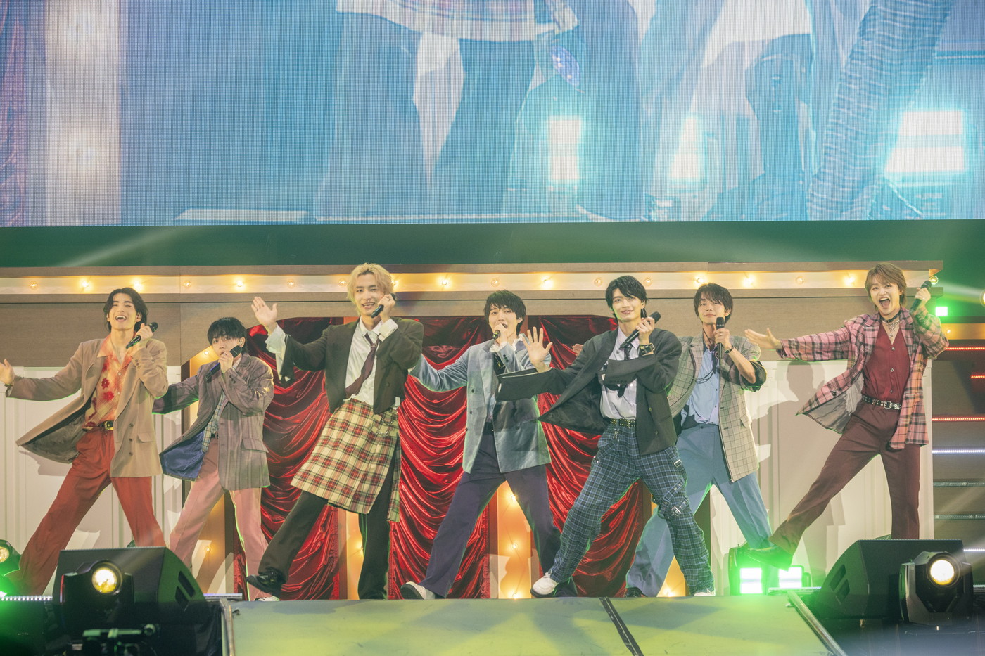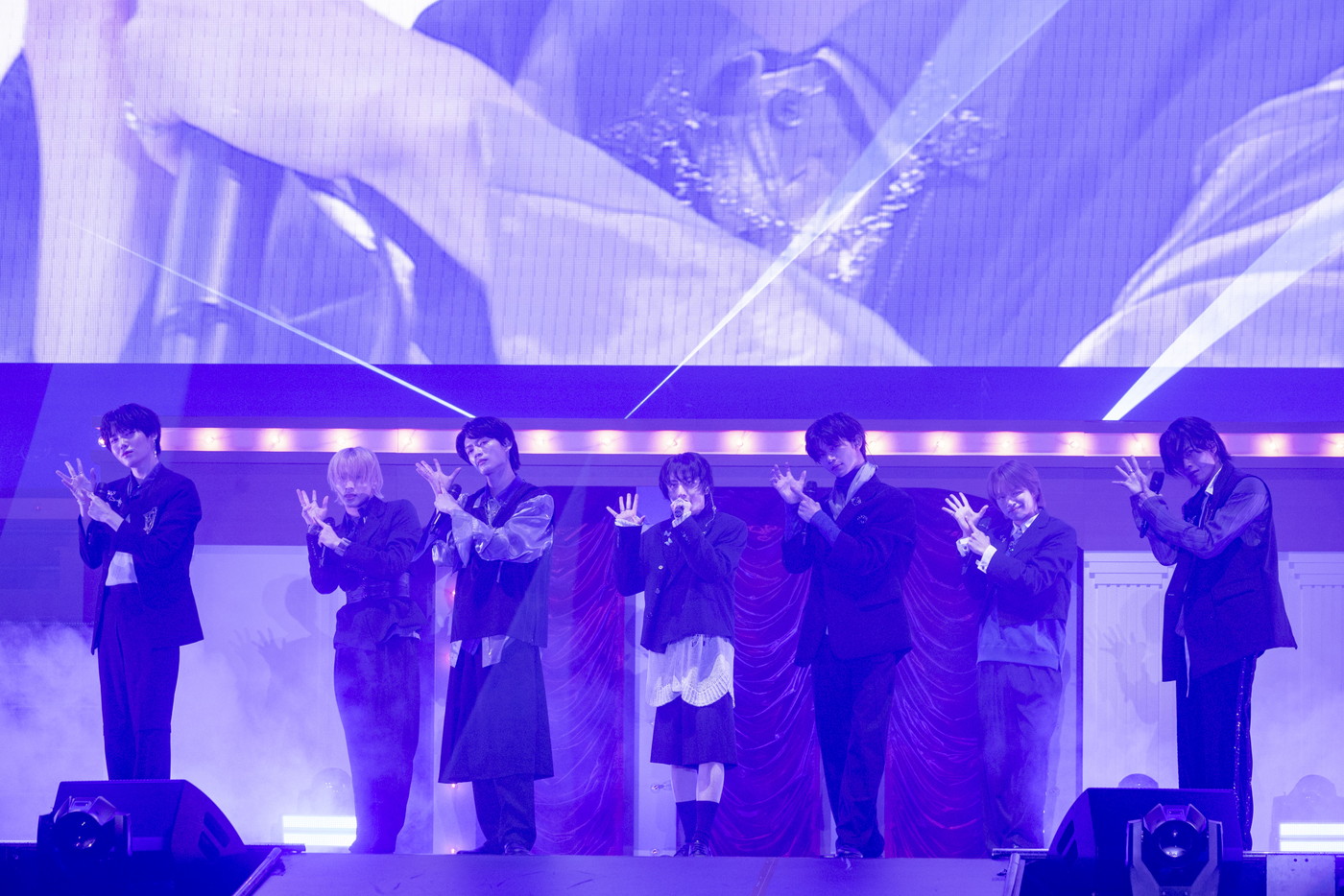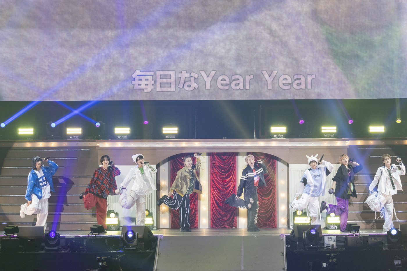 BUDDiiSのターンでは「みんなにめっちゃ会いたかったです! 楽しんでいきましょう!」と、まずはリーダーのFUMINORIが呼びかけ。「Brightness」の歌詞をビジョンに映し、センターステージの花道いっぱいに広がって、十人十色それぞれの色の素晴らしさを全方向のオーディエンスに訴えていく。一転、原因は自分にある。は、アニメ『エグミレガシー』の主題歌「P-P-P-PERO」をはちきれそうな笑顔でパフォーマンス。バレエ音楽『くるみ割り人形』のサンプリングでダークファンタジーな要素も交えつつ、7人でラインダンスして最後は大倉空人がペロリと舌を出し、場内に黄色い悲鳴を上げさせた。