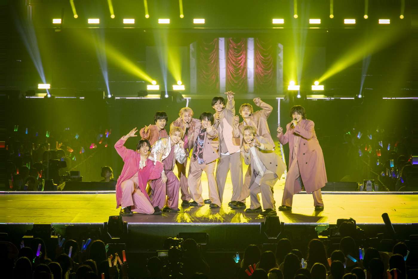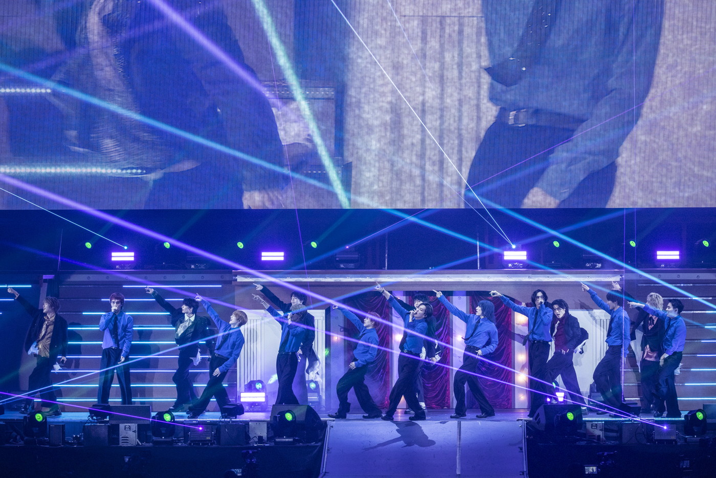 SUPER★DRAGONは、飯島颯と池田彪馬の背に古川毅が立ち上がり、第一声を高らかに上げる「Tap tap tap!」でギア全開に。あらたなアンセムとすべく数々のライブで育ててきたパワフルなダンスをセンターステージで繰り出す彼らの背後には、スパークラーの火花が! 力強く足を踏み鳴らし、ひたすらに自分の道を進むという熱い決意を打ち鳴らして、灼熱の風を呼び込んだ。対して、危険な情熱を撒き散らしたのがM!LKの「labyrinth」。最初にライトを浴びた山中柔太朗が悩ましげに純白のジャケットをまくり上げて素肌を晒せば、どことなくエキゾチックなトラックに乗せ、ステージ上のソファやベンチにはべった5人が濃厚に絡み合う。曽野舜太が山中を腕の中に囲ったり、佐野勇斗と吉田仁人、塩崎太智(「崎」は、たつさきが正式表記)がキス寸前まで顔を近づければ、客席は阿鼻叫喚。