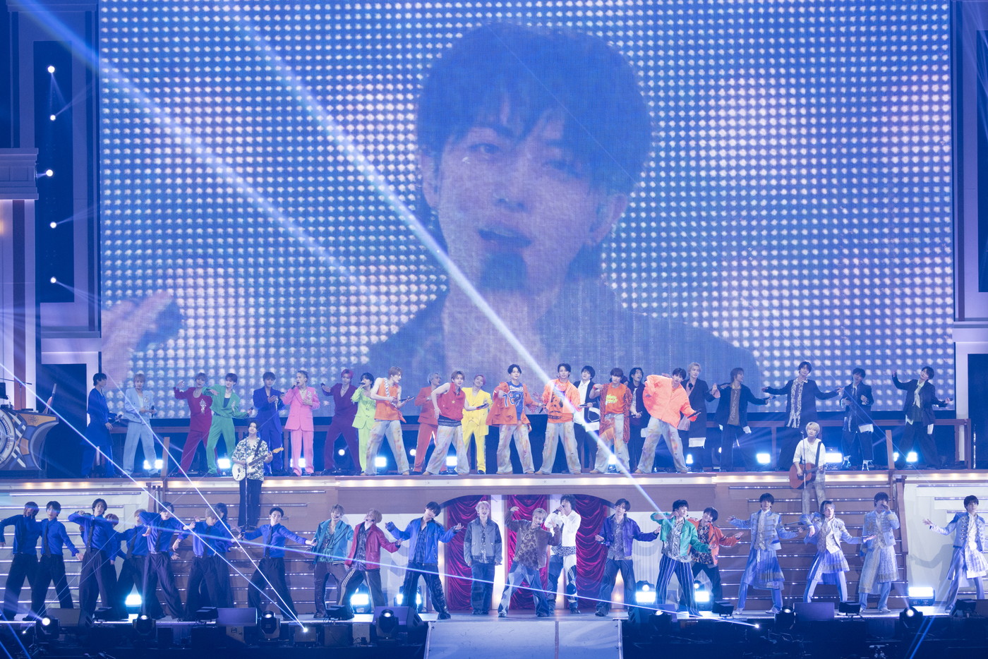さらに、原因は自分にある。の「Museum:0」では、冒頭からファイヤーボールが! ドラムが打ち鳴らされるラウドロックにピアノが乗る不穏に壮大なナンバーで激しく躍動し、ラップの応酬を交わして、終盤、巨大ビジョンに狂気の笑みを映し出す7人の姿は、まるでアートだ。ここで異なるベクトルからアートを演出したのは、ONE N’ ONLYの「DOMINO」。スモークが噴き出すなか、YouTube再生数が220万回を突破したラテンフレーバーたっぷりのブラジリアンファンクで隊列を作り、隙のないダンスでオーディエンスを揺らしまくる。続いてさくらしめじは、田中雅功が作詞を、高田彪我が作曲を手掛けた「生きるよ」を披露。高田のエレキギターと田中のアコースティックギターが3拍子のリズムで軽やかに音色を重ね合わせながら、タイトルどおりの決意に満ちた“熱い”メッセージでオーディエンスの胸を詰まらせた。