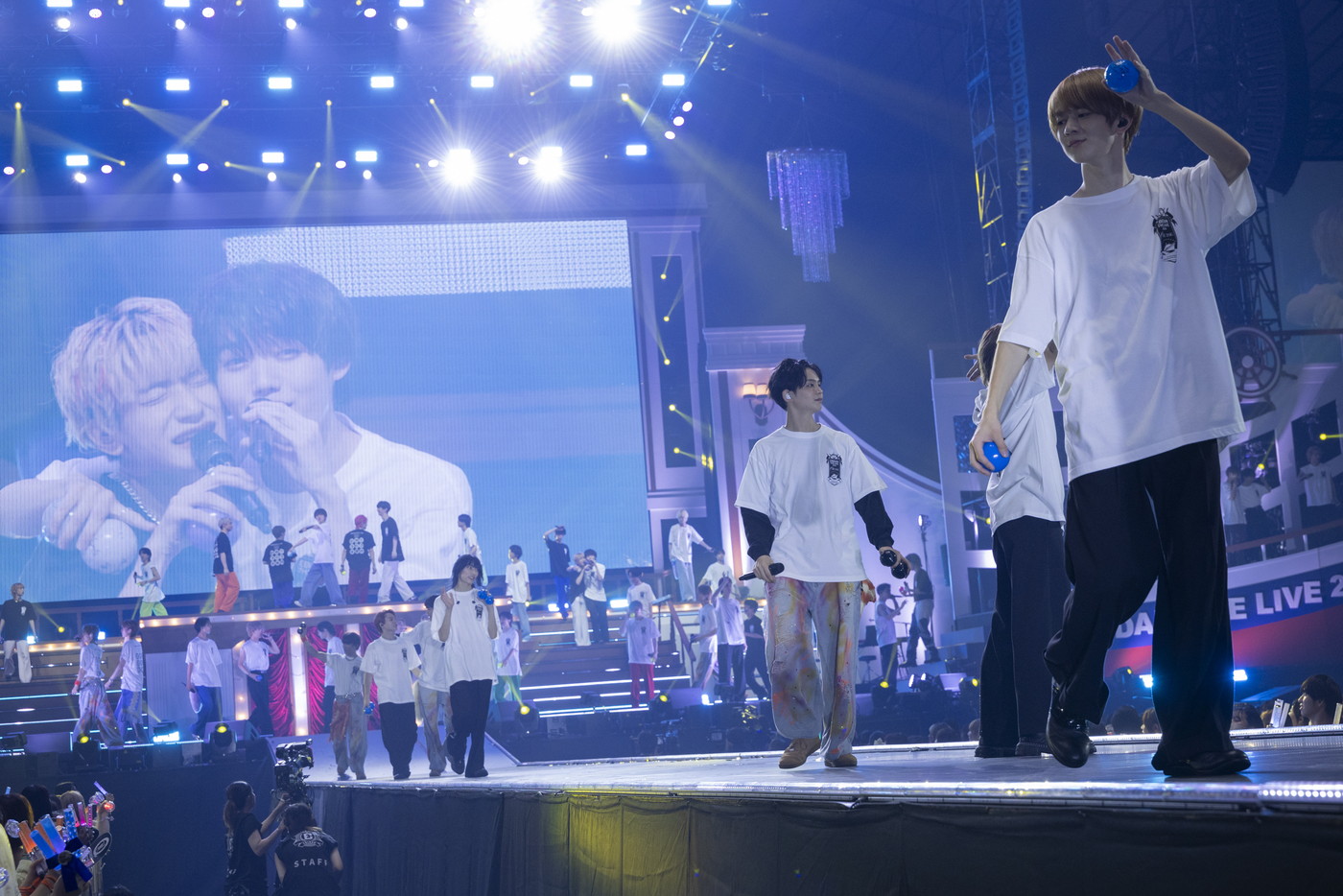 直後、メインステージでコラボしたのは、SUPER★DRAGONと原因は自分にある。の2組だ。まず、原因は自分にある。の7人が「原因は君にもある。」を歌い踊り、2日目の1部では杢代和人が“明らかに潤くん、誕生日おめでとう!”と曲中の台詞を歌い替えて、8月18日が誕生日の武藤潤の頬にキス。場内をヒートアップさせたところで、青いシャツと黒いパンツのSUPER★DRAGON9人が後ろから合流し、黒を纏ったげんじぶのハイスピードなダンスを彩って、場内のペンライトを大きく揺らしていく。そこからジャン海渡が「最高に盛り上がっていこうぜ!」と告げてSUPER★DRAGONの「So Woo」へ続くと、スモークのなかでファンクを踊るげんじぶ7人というレアな光景にオーディエンスは釘付けに。メンバー自身も笑顔で身体を揺らしながらスパドラメンバーと向き合い、武藤や大倉空人はマイクを握ってやり合っていく。スパドラ側も、ジャンと松村和哉はエモーションのままラップにアレンジを利かせまくって、普段と違うシチュエーションを存分に楽しんでいる模様。2グループともに、異なる個性の相乗効果を充実感いっぱいに果たしていった。