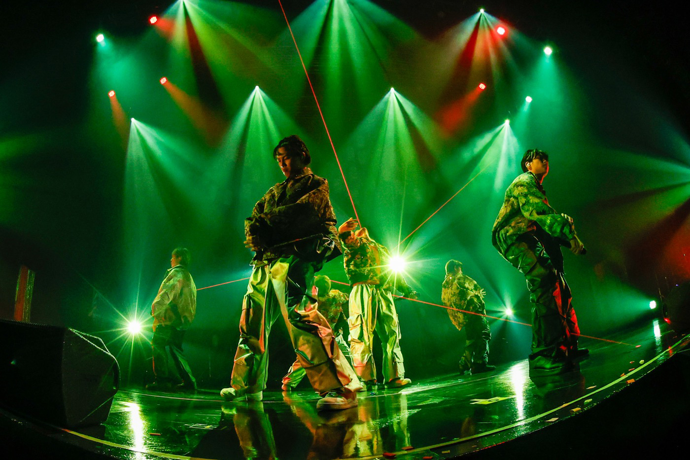 「最後は素敵な思い出を一緒に作っていきましょう」と、HAYATOのラップで始まった本編ラスト曲は「STARLIGHT ~未来ノトビラ~」。ミラーボールが回ってタイトルどおりのまばゆい世界が広がるなか、TETTA、REI、EIKUの深みあるボーカルと丁寧な歌いぶりが胸に沁みる。“輝き放つ前の君は 原石さ”とEIKUが歌う、まさに未来への扉を開いてくれるような強い想いが一つひとつの動きと声から溢れ、薄絹が重なるような3本のユニゾンとラッパー陣による星のまたたきのようなウイスパーのコラボも美しく、場内には大きな拍手が湧いた。