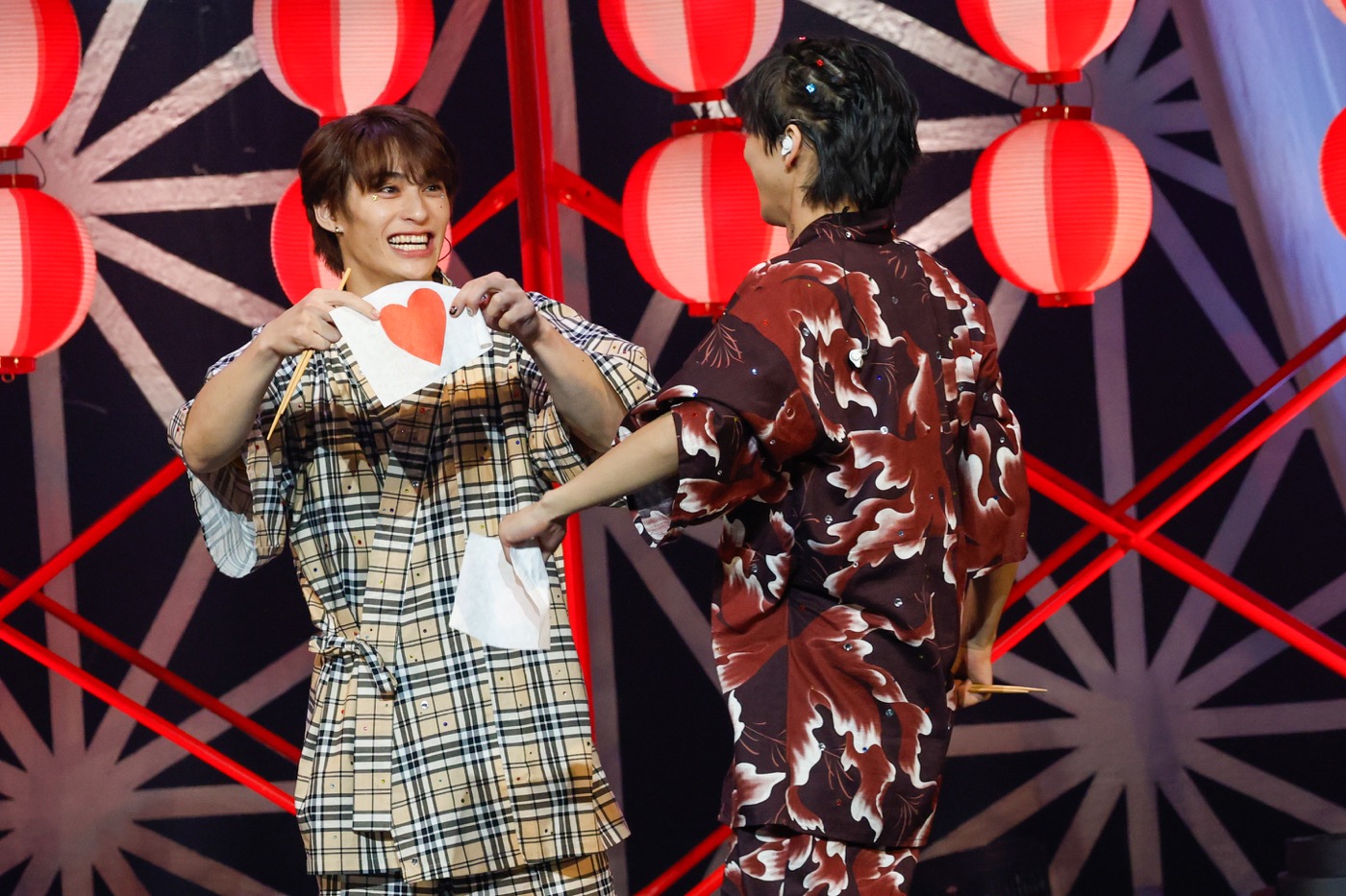 櫓のうえからひとりが紙を3回落とし、階下のふたりが割りばしでキャッチする“割りばし掴みゲーム”でも、毎回どちらのチームも1~2枚しか掴めていなかったのが、東京2日目の最終公演でTETTA、HAYATO、KENSHINのチョコバナナチームが遂に3枚すべてをキャッチ。初の偉業に抱き合って喜んでいた。