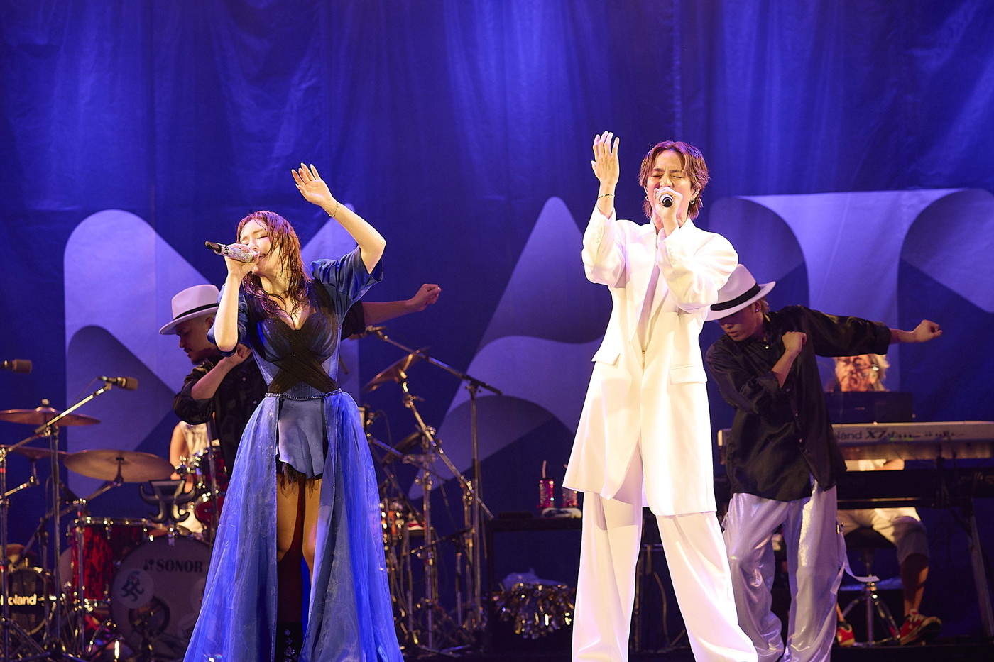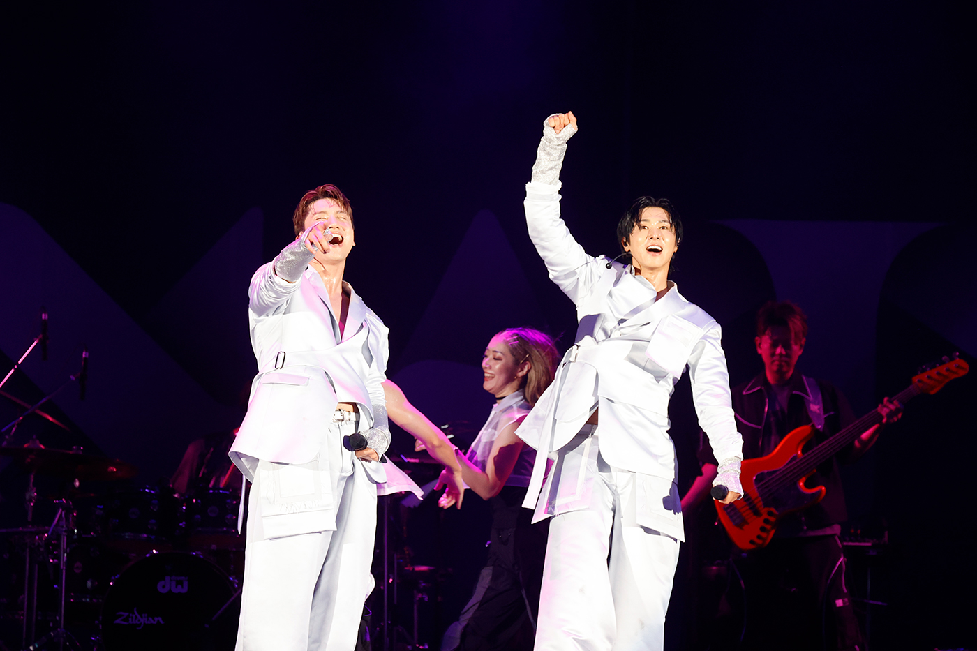 「OCEAN」ではそれぞれフロートに乗りアリーナへと出航。アリーナのいちばん後ろで交わったふたりは向き合って「Somebody To Love」を歌い、フロート上からフリスビーを客席へと投げ込んでいく。熱狂の度合いを増したなか、最後はサマーチューン「Hot Hot Hot」で“夏の恋はFireworks/火遊びに少し付き合ってよ”と歌うと、ステージのうえから本物の花火が次々に打ち上がるドラマチックな演出で2024年の『a-nation』はフィナーレへ。