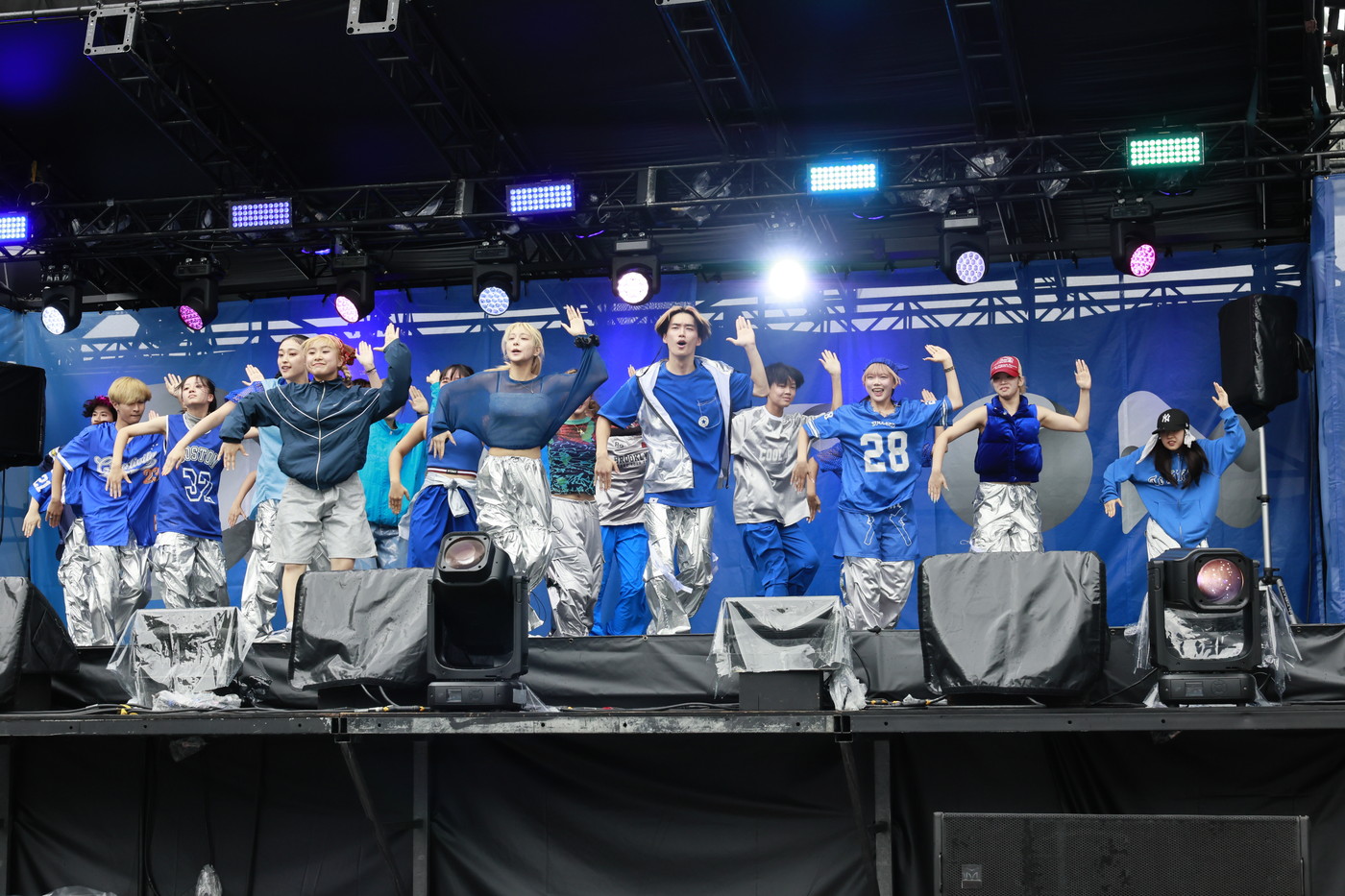 オープニングアクトの2番手は、TikTokのダンス動画で話題の仮面集団、夏休みの自由研究をバズらせたい小中学生集団がサプライズ登場。「Around the world」でなめらかなムーブを繰り出して濃密な空気感を醸し出す。「WA・BI・SA・BI」ではメンバー14人そろってお辞儀ダンス。愛らしいアクションとテクニカルなダンスのギャップで観客たちの目を奪った。