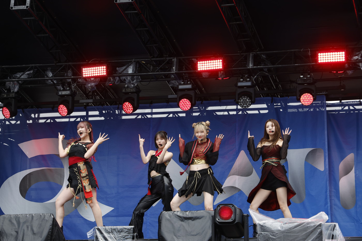 シューティングアクトに“Japanese Classy Crush”をコンセプトに持つ気鋭のガールズグループ@onefiveが登場。「F.A.F.O」から約10年一緒に活動してきた4人ならではの息の合ったダンスパフォーマンスを繰り広げ、かわいらしさをフィーチャーしたかと思えば、続く新曲の「KAGUYA」ではクールな和テイストを効かせながらOZGi remixでのお辞儀の振りも注目を集め、会場をお祭りムードに染めた。