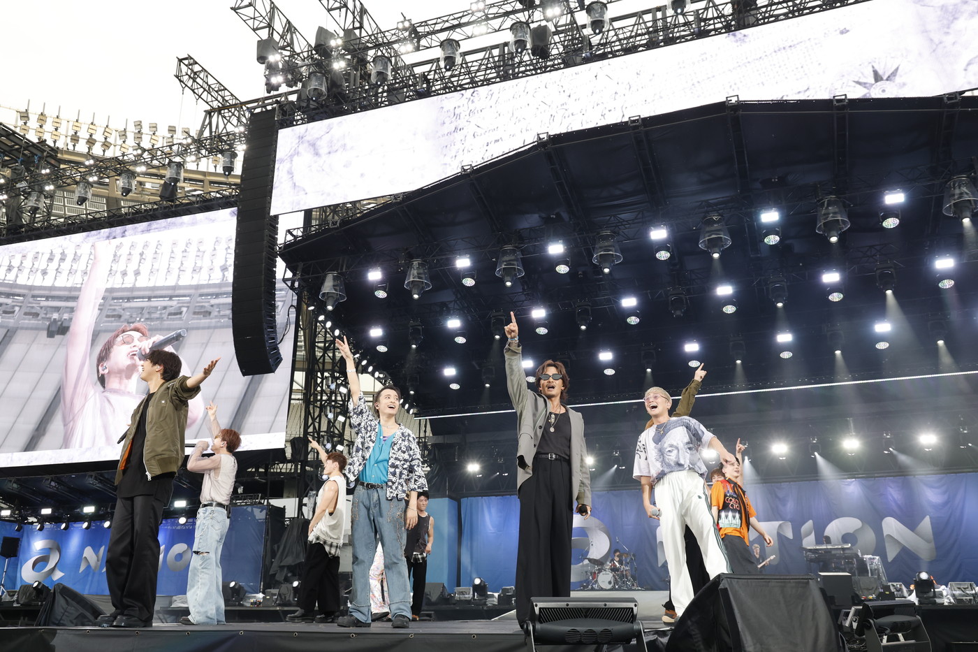2017年以来7年ぶりの『a-nation』出演となったGENERATIONSは、「エンドレス・ジャーニー」でハッピーな幕開け。片寄涼太と数原龍友のボーカルに乗るパフォーマンスは、続く「Diamonds」で一気にタフなものとなり、噴き上がる炎も相まって不穏なムード満点に。さらに会場を大きく揺らす「AGEHA」でエネルギーをさらに上昇させ、EXILEのサマーソング「SUMMER TIME LOVE」では花道に飛び出して観客たちの間近に迫り、6人でのシンクロダンスで甘い時間を演出していく。