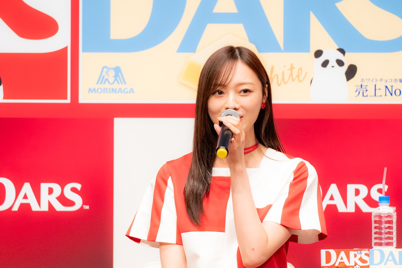賀喜は、「“ダース”のアンバサダーに就任させていただいてから、3年間ずっと白担当でやらせていただいて、今回こうしてまた衣装を着て参加できるのがうれしいです。“ダース”はやっぱり赤のイメージが強いかもしれませんが、“白いダース”、“香るダース”と、実はホワイトチョコが特徴的なブランドかなと思います。“白いダース”の魅力もたくさん伝えていけるように頑張りたいと思います」と答え、“白いダース”をもっと広めたいという強い意気込みを語った。