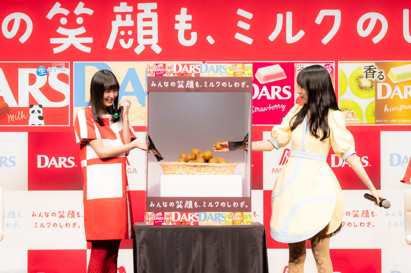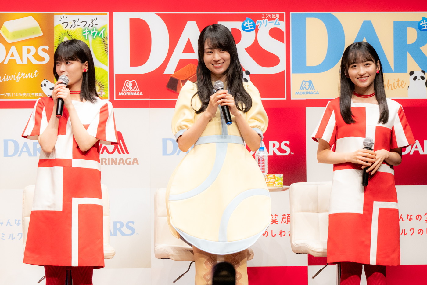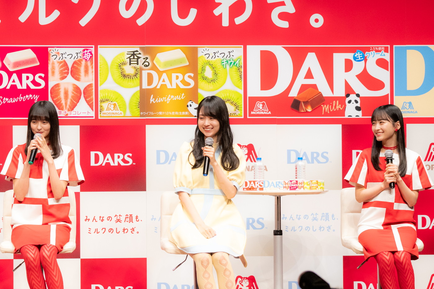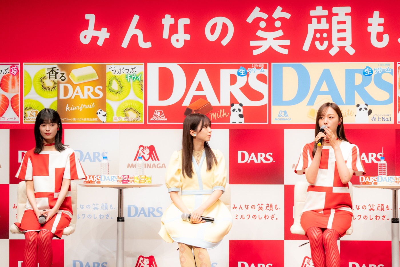 また、“ダース<ミルク>”について遠藤は「生クリームを使用した濃厚なミルクの味わいと、キレのいい甘さが特徴になっていて、みんなから愛される味だと思っています」、“白いダース”について賀喜は「“白いダース”が個人的にめちゃめちゃ好きで、ちょっと特別感があるというか。色も白でかわいいし、濃厚な甘さやミルク感もあり、ひと口食べただけですっごい幸せになれます。もう、いいところしかないと思いますね」と、それぞれ一生懸命アピールした。