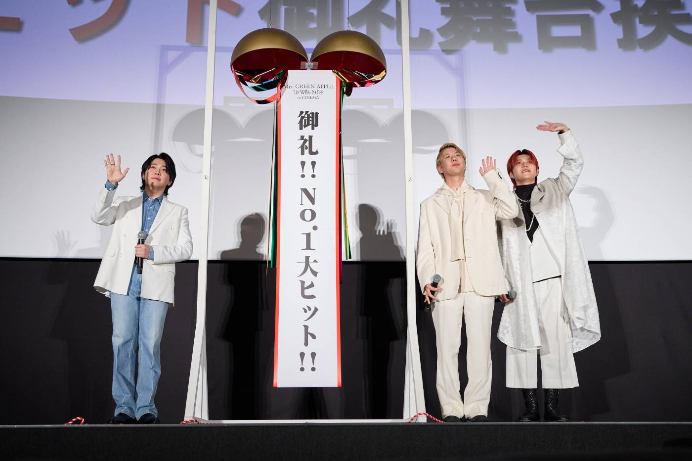 快進撃を祝い、9月22日、東京・丸の内ピカデリー1に、ミセスのメンバー・大森元貴(Vo./Gu.)、若井滉斗(Gu.)、藤澤涼架(Key.)が登壇して、大ヒット中の本作を記念して舞台挨拶を行った。