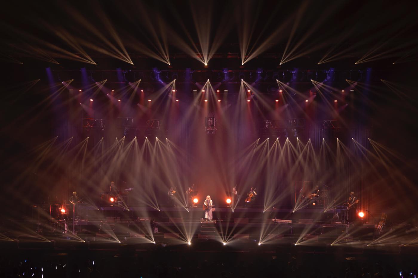 続いて弦カルテットがステージに登場すると、生演奏によるクラシックの名曲が会場を満たしていく。神崎エルザ starring ReoNaの楽曲はいずれもクラシック音楽をモチーフにしていることもあって、この先のライブへの期待が高まる演出だ。そしてパッヘルベルの「カノン」が奏でられるなか、バンドが登場してスタンバイし、神崎エルザ starring ReoNaのステージが始まる。彼女が1曲目に選んだのは「ピルグリム」。ReoNaとしてのキャリアにおいても大切な始まりの歌だ。先ほどとは対照的な白いワンピースを着て裸足でステージに立つReoNa。いや、いまの彼女は“ReoNa”ではなく“神崎エルザ starring ReoNa”だ。エルザの魂をその身に降ろした彼女は、自ら爪弾くアコギやストリングスの音色も交えながら、命が尽きるまで終わることのない、果てしない巡礼の旅路のあらたな一歩を踏み出す。