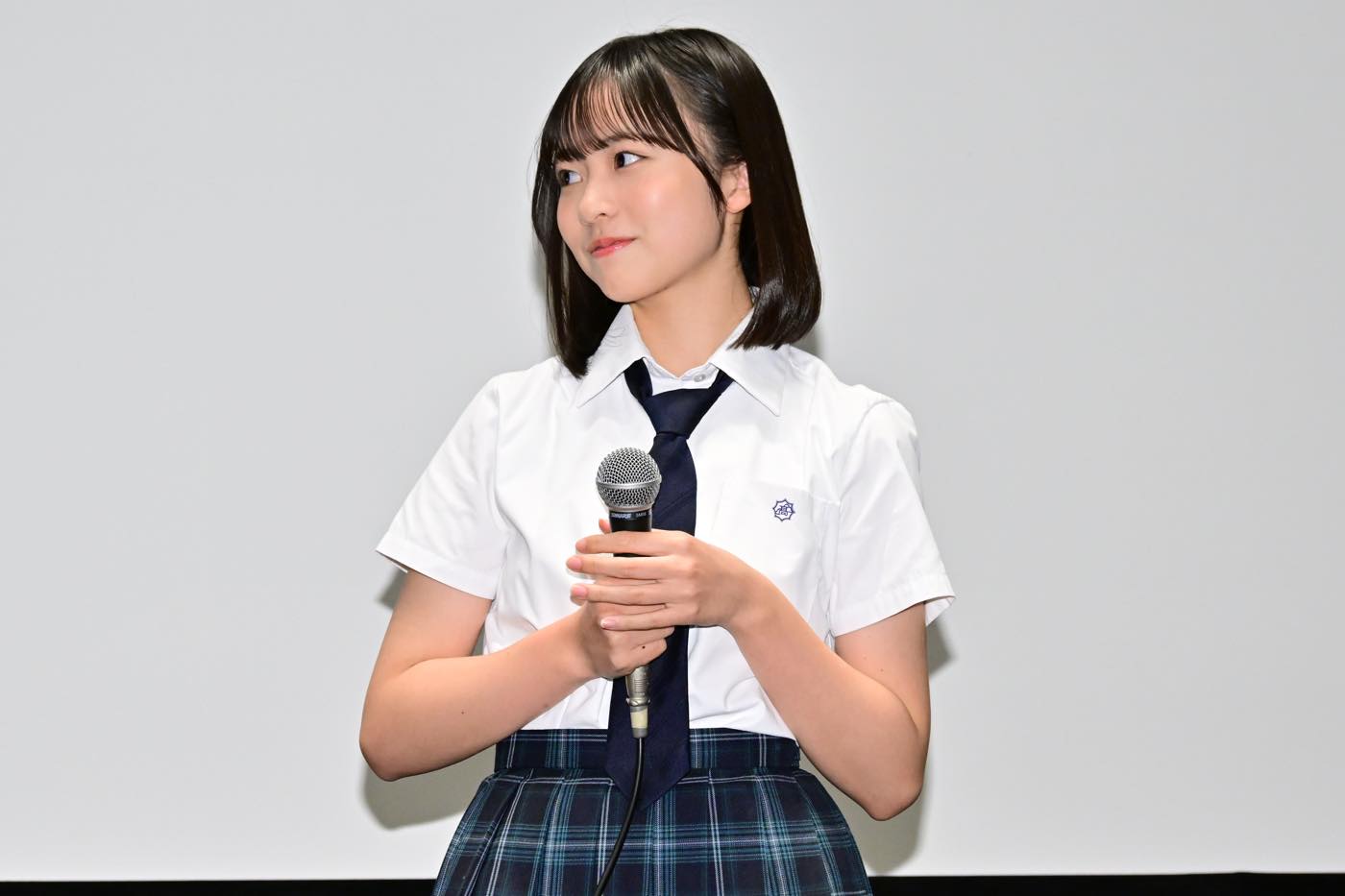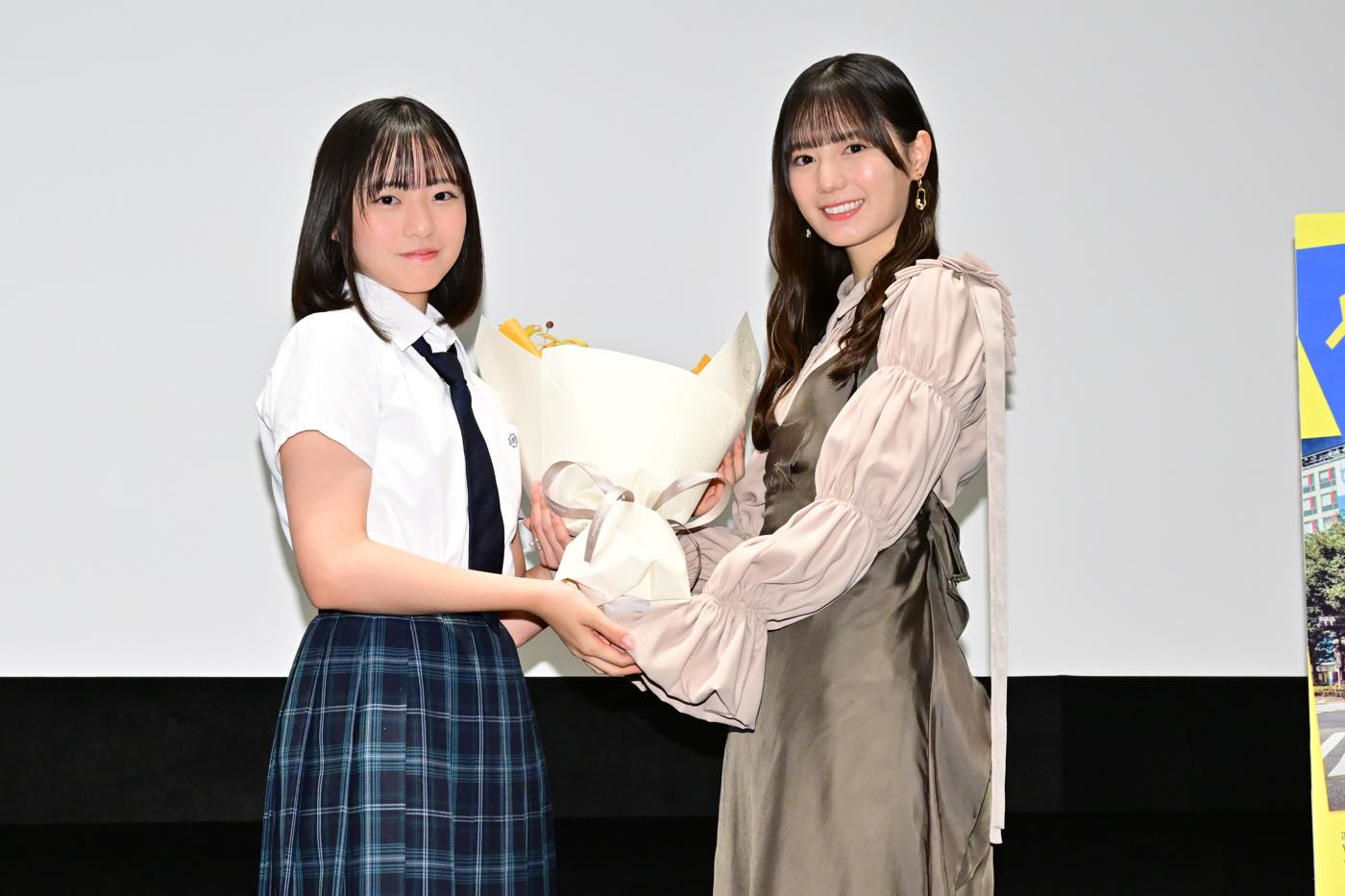 そんななか、憧れのアイドル・有川凛役を演じた小坂が、四期生の映画初出演のお祝いと激励のためにふたりに花束贈呈。撮影中から四期生を見守っていたという小坂は「公開日が近づいていると身に染みて感じます」と後輩の晴れ舞台にドキドキしながら、アイドル役については「私でいいのかな?と思ったけれど、四期生が頑張るなかで私もひとつ力になれたらと思った」と先輩として胸を貸したと打ち明けた。