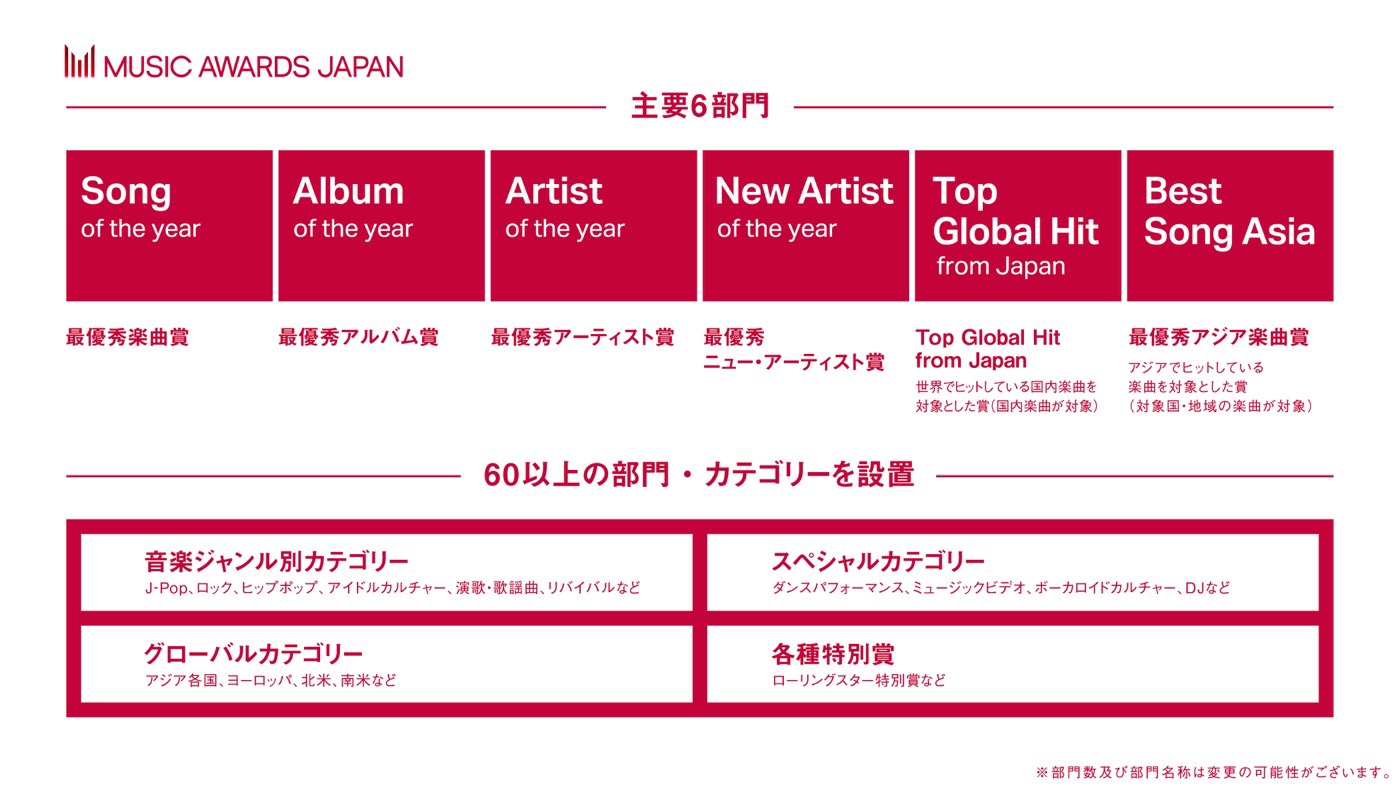 『MUSIC AWARDS JAPAN』では、主要6部⾨をはじめ60以上の部⾨を設置予定。主要6部⾨は「最優秀楽曲賞」「最優秀アルバム賞」「最優秀アーティスト賞」「最優秀ニュー・アーティスト賞」「Top Global Hit from Japan」「最優秀アジア楽曲賞」の6部門となっている。