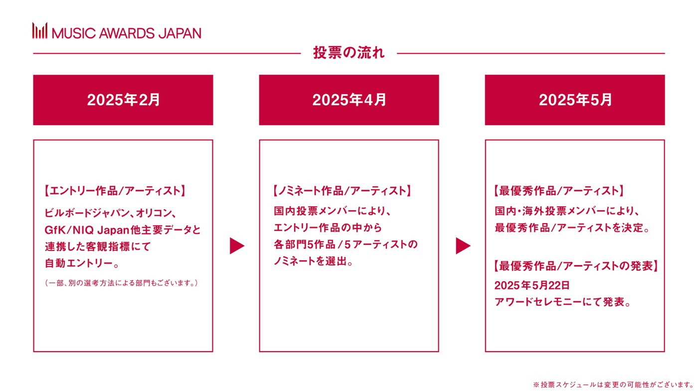 アーティスト、クリエイター、マネージャー、レコード会社スタッフ、エンジニア、MVディレクター、コンサートプロモーター、⾳楽出版社、著作権管理団体・事業者、⾳楽配信事業者、ディーラー、ディストリビューター、⾳楽評論家、ライター、メディア、 海外⾳楽賞審査員、海外クリエイター、海外プロモーター、海外⾳楽配信事業者など、各分野の音楽業界関係者により構成される、5,000名以上の投票メンバーにて厳正なる投票を予定。