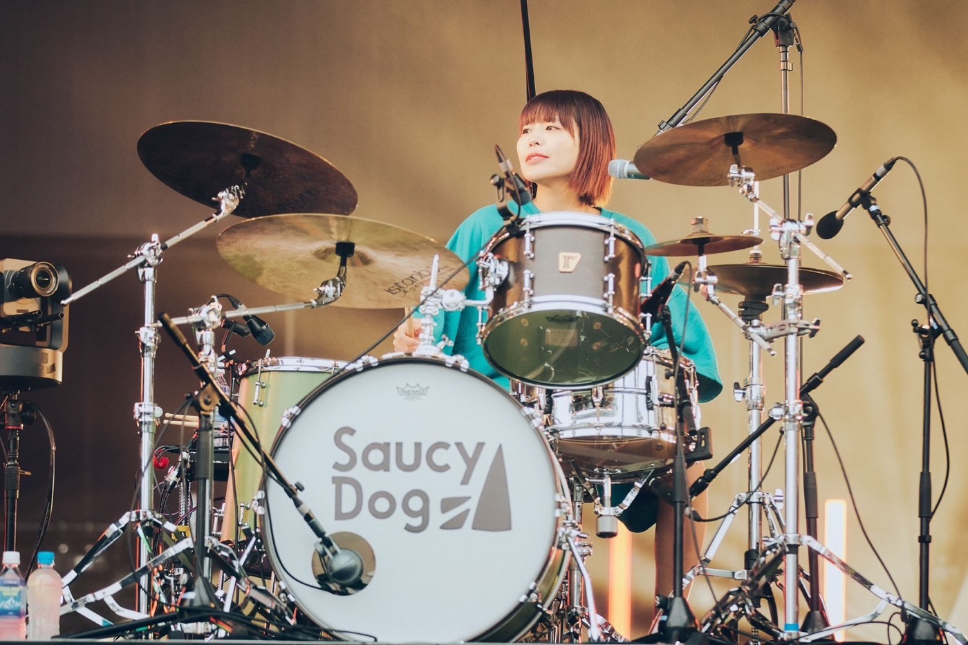 1日目、2番手に登場したのはSaucy Dog。ステージに登場し、石原慎也が1曲目「シンデレラボーイ」のイントロを奏で始めると、静かな興奮が波紋のように、観客たちに伝わる。3ピースのアンサンブルが、飾り立てることなく、嘘なく、会場に響きわたる。こんなにも剥き出しなのに、なんて滑らかで穏やかなバンドサウンドだろう。「このフェスの1回目が、あなたの心にずっと刺さって残っていくように」という石原の言葉に続けて披露された「くせげ」、秋澤和貴のベースソロから突き進むように力強く響いた「雷に打たれて」など、色とりどりの楽曲を披露していく。MCで、せとゆいかはフェスや海外公演でも共演してきた自分たちと[Alexandros]との関係を振り返り「こんなにも大事な日に呼んでいただけたこと、すごくすごくうれしく思います」と感謝を伝えた。自腹で買ったというTHIS FESグッズを身に付けた石原もまた「([Alexandros]は)俺たちは持っていないものをいっぱい持っていて。…俺たちしか持っていないものはないかもしれないけど、俺たちにしかできないことはあると思うので」と告げる。最後は「Be yourself」で「THIS FES最高ー!」と叫んでかっこよく締めたかと思えば、「あと5分残ってた!」と、最後の最後に「優しさに溢れた世界で」を駆けこむように披露。自然体で、でも祈りとメッセージはしっかり抱きしめている――そんなSaucy Dogにしか描くことのできない空間が、相模原に生まれた。