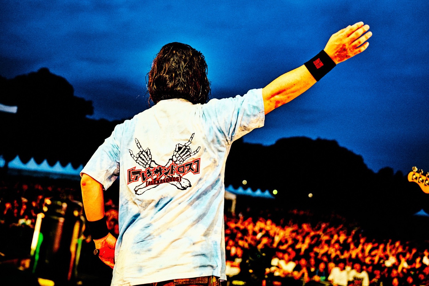 「今日は[Alexandros]に最大限の殺意を愛情に込めて、『殺る』覚悟でやってきました!」――そんなダイスケはんの叫びが陽が落ち始めた相模原の空に響きわたる。1日目、5番手に登場したマキシマム ザ ホルモン。初っ端からヘドバンが巻き起こった「What’s up,people?!」、重厚なポップなヘヴィネスの中からメロディが飛翔する「「F」」、それに天国と地獄を瞬間移動するように表情を変えていく「殺意vs殺意」など、ゴリッゴリにカオティック、なのに安寧と温かさをも感じさせるパフォーマンスでTHIS FESのステージを席巻する。2023年は対バンツアー『THIS SUMMER FESTIVAL TOUR ’23』で共演した[Alexandros]とマキシマム ザ ホルモンだが、そのとき[Alexandros]からプレゼントされたというオリジナルTシャツ(ドロスのロゴのタッチでホルモンの名前がプリントされている)をステージでお披露目するなど、両者の深い繋がりを感じさせる場面も。MCでのダイスケはんの「野生の白井くんと会ったときの話」では笑いが起こっていたが、舞台袖で苦笑いしている白井の姿がモニターに映っていたのも見ものだった。ナヲの言葉を借りるならば「ステージも、客席も、国籍も関係ない全員のホーム」まさにそんな空間。ラストの「恋のスペルマ」が終わったあとには、でっかい怪獣が通ったあとみたいな余韻が残った。ちなみに「[Alexandros]から絶え間なく注がれる愛に気持ちを込めて歌います。聴いてください、『HOWEVER』」という、ダイスケはんが放ったひと言は、このあとしっかり伏線回収されることになる――。