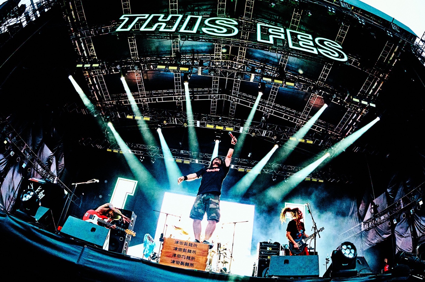 [Alexandros]の4人による宣誓に続き、1日目のトップバッターを飾ったのはPEOPLE 1。音と感情と体がステージの上をもんどり打ち、飛び跳ね、解き放たれ、ぶちまけられ、でも、それらがバラバラになって壊れてしまわないギリギリのバランスで、鮮やかな光のような景色が生み出されていく。Takeuchiいわく「祝福の音頭」として響きわたった1曲目「新訳:スクール!!」から、肉体的で躍動感のある演奏に、観客たちもハンドクラップやジャンプで応える。「DOGLAND」のはじまりにはDeuの遠吠えがこだまし、「エッジワース・カイパーベルト」では観客たちのタオルがヒラヒラくるくると華やかに回転し、壮観だった。MCでItoは[Alexandros]の15周年を祝福し、スタッフ含めこの空間を作った人々への感謝と感動を語りながら「ここからは、みんななりの愛とリスペクトをぶつけてください。『もうTHIS FES大成功じゃん』と思ってもらえるくらい。それが僕の思うトップバッターの役目なので」と告げた。歌うときは屈みながら振り絞るように歌うDeuは最後、真っ直ぐ観客を見つめながら「それがどれだけ細い道でも、きっと誰にでも幸せは訪れると信じたい」と語り、ラストの「メリバ」を披露。激しく、繊細で、優しい、PEOPLE 1らしいやり方で、見事にフェスの幕開けを飾った。