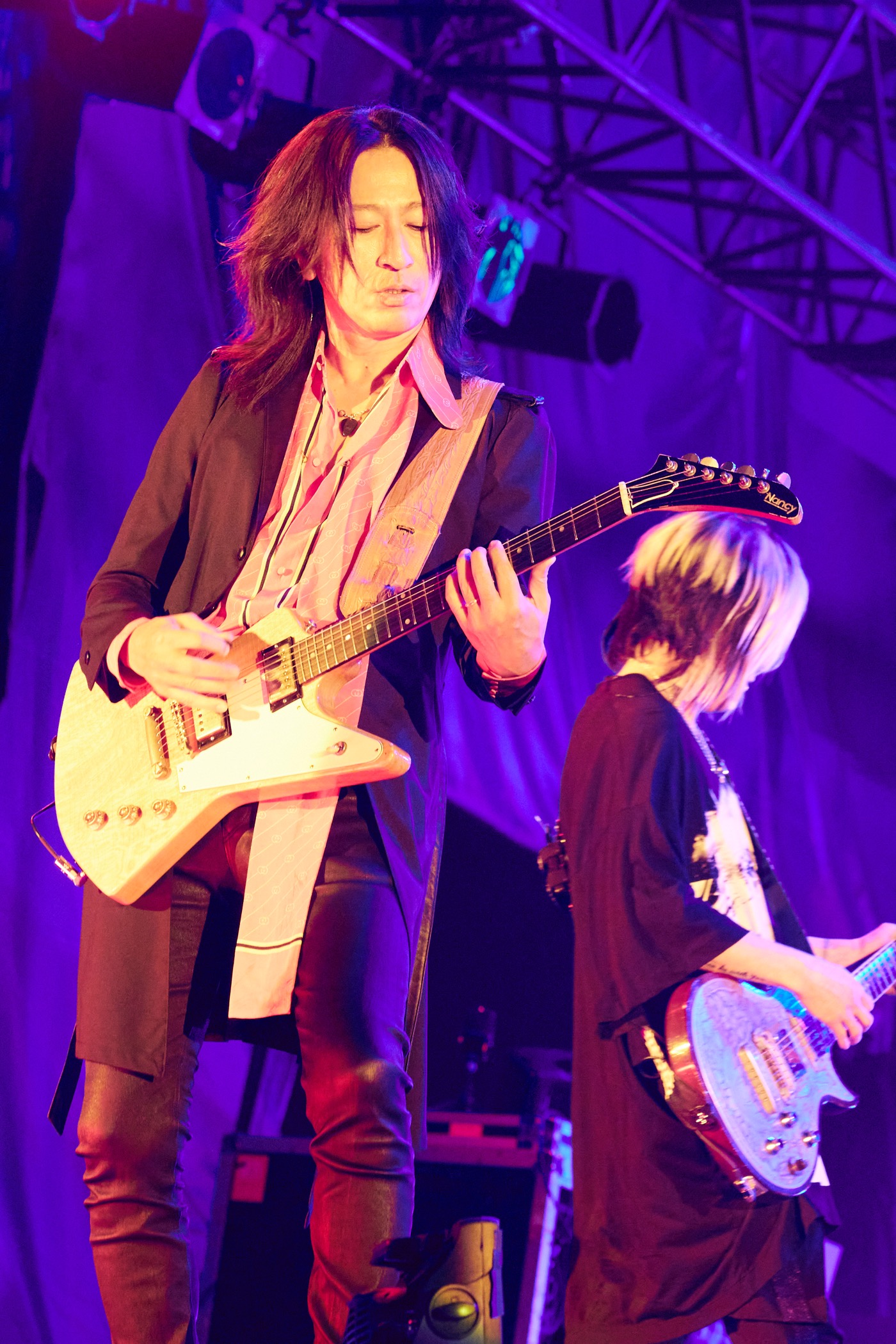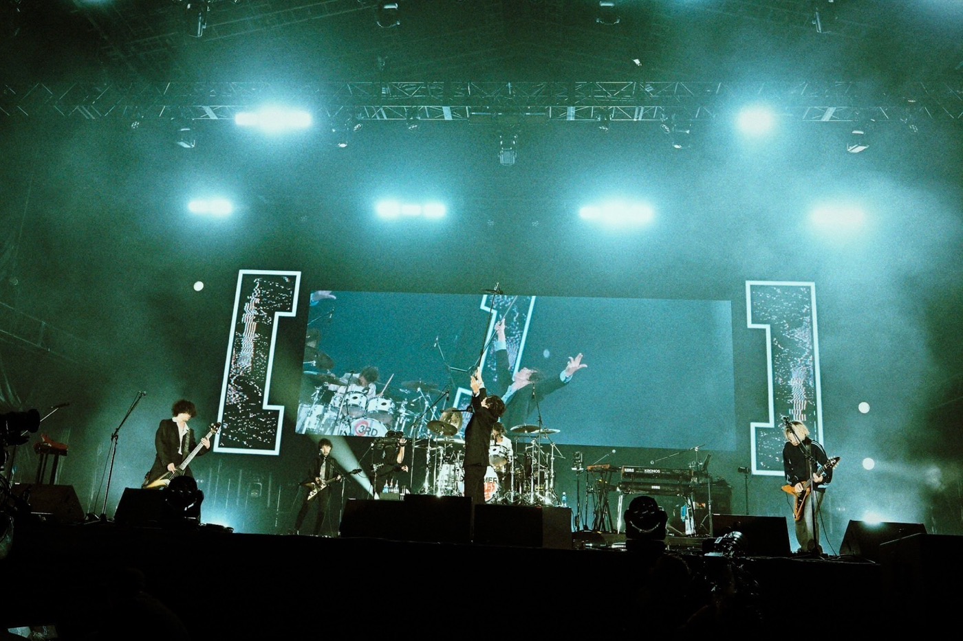 空も夜の闇に包まれ、ステージセットの緑色のネオンライトが煌々と輝くなかで登場した1日目6番手、GLAY。1曲目のイントロが響きわたると、オーディエンスからどよめきが起こる――「HOWEVER」だ。この美しく普遍的な名曲を相模原の夜空に盛大に羽ばたかせ、ライブがはじまる。TERUは「2年間、小田急相模原に住んでいたことがあります。ただいま!」と告げると、「サバイバル」「口唇」と、往年の名曲たちを獰猛でパワフルなバンドサウンドで立て続けに披露。全曲サイドモニターには全編の歌詞が映し出されており、音と言葉で一気に体と体を鷲掴みにされる。「ヒロくん(磯部寛之)がよく聴いていてくれた曲」という紹介ではじまったバラード「May Fair」を披露すると、さらに火柱が上がる激しい演出の中で披露された新曲「whodunit」の最中には[Alexandros]「Dracula La」のカバーを差し込むなど、粋な演出も。時代を背負い、時代を作ってきたバンドとしての貫禄と求心力が重たく轟くとともに、今でも新しくなり続けるバンドとしての柔軟性と軽やかさが清々しく鳴り響く。TERUが小田急相模原に住んでいたのは32年前だと言っていたが、キャリアを重ねながらも、こんなにも艶やかで、逞しく、無邪気であることができるなんて奇跡のようだ。狂おしく疾走する「彼女の「Modern…」」、そしてラストを飾った「誘惑」ではオーディエンスの声も重なり、爽やかな一体感を生み出した。