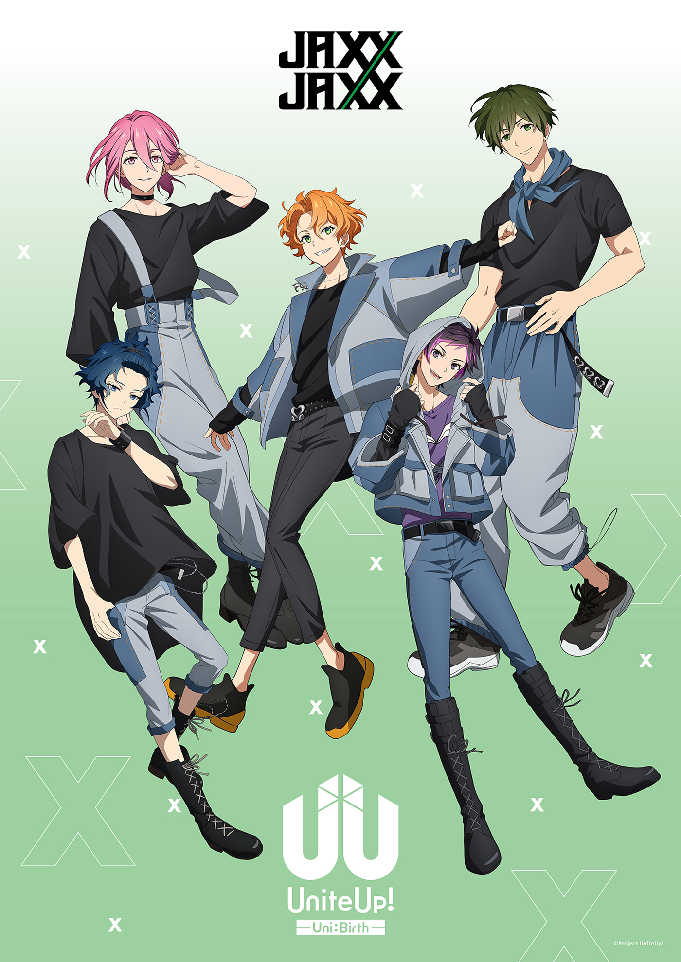 JAXX/JAXXは、シンガーソングライターとしても活動しているmasa(春賀楽翔/Vo)と、映像や舞台を中心に活動している下前祐貴(桂ほまれ/Key)、馬越琢己(香椎一澄/Dr)、坪倉康晴(若桜潤/Ba)、高本学(森ノ宮奏太/Gu)の5人によるバンドスタイルのユニット。