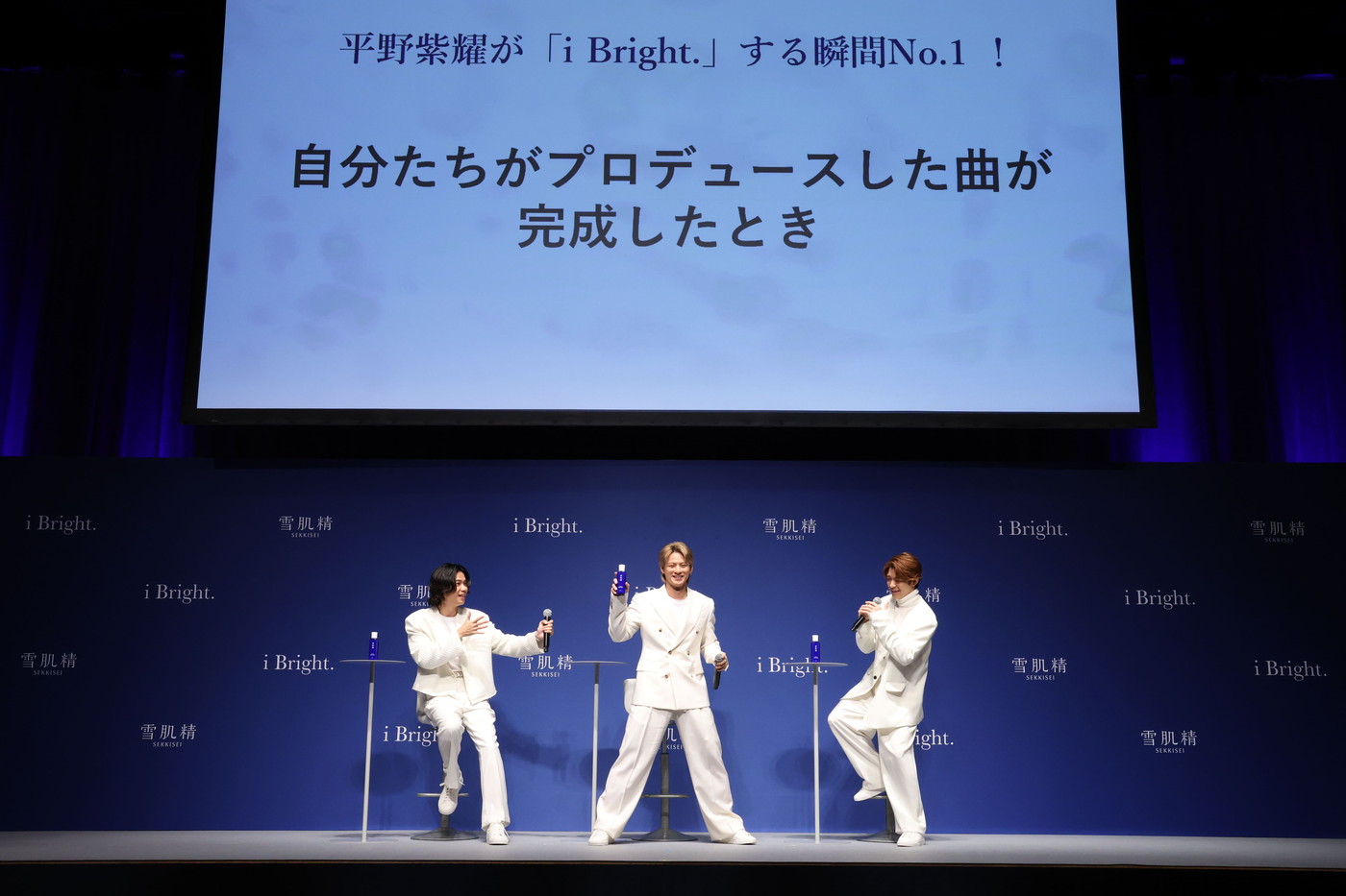 また、キーメッセージの『i Bright.-前を向く、この肌に。-』に合わせて、自身が「i Bright.する瞬間」を、3名それぞれから発表。神宮寺は「自分が満足いくものがつくれてみんなに届けられたとき」、平野は「自分たちがプロデュースした曲が完成したとき」、岸は「筋トレしてるとき」。