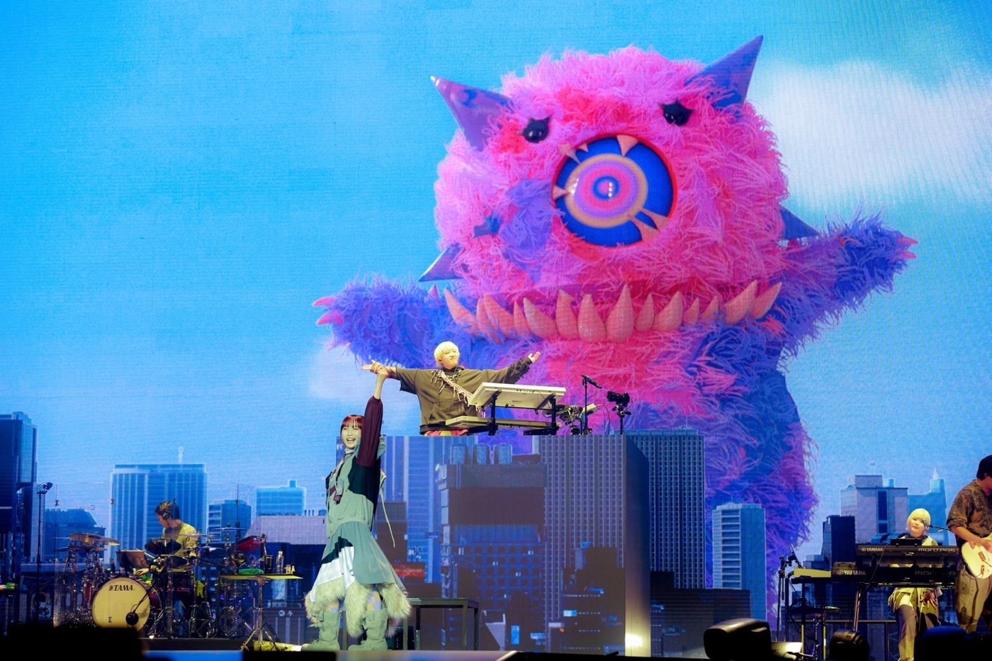 和やかに写真撮影を終えてゲストを見送ると、INSPIRE ARENAは再び“超現実”の世界へ。「怪物」「勇者」「あの夢をなぞって」では、あらたなサポートメンバーを加えたバンドが力強いグルーヴを響かせる。