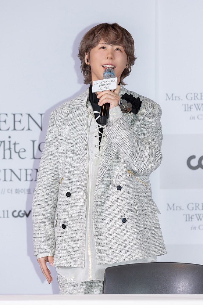 イベントでは、観客から事前に募集した質問にも回答。まず初めに「メンバーの皆さんにとってMrs. GREEN APPLEとはどんな存在?」という質問に対して、「私にとってMrs. GREEN APPLEは大きい愛で家族以上の存在です」と韓国語で愛を語った若井、そして「僕にとってはお家のような存在です。最近それぞれいろいろな活動をしているのですが、その各々の活動がMrs. GREEN APPLEというお家にまた帰ってくるという感覚があります」と藤澤。