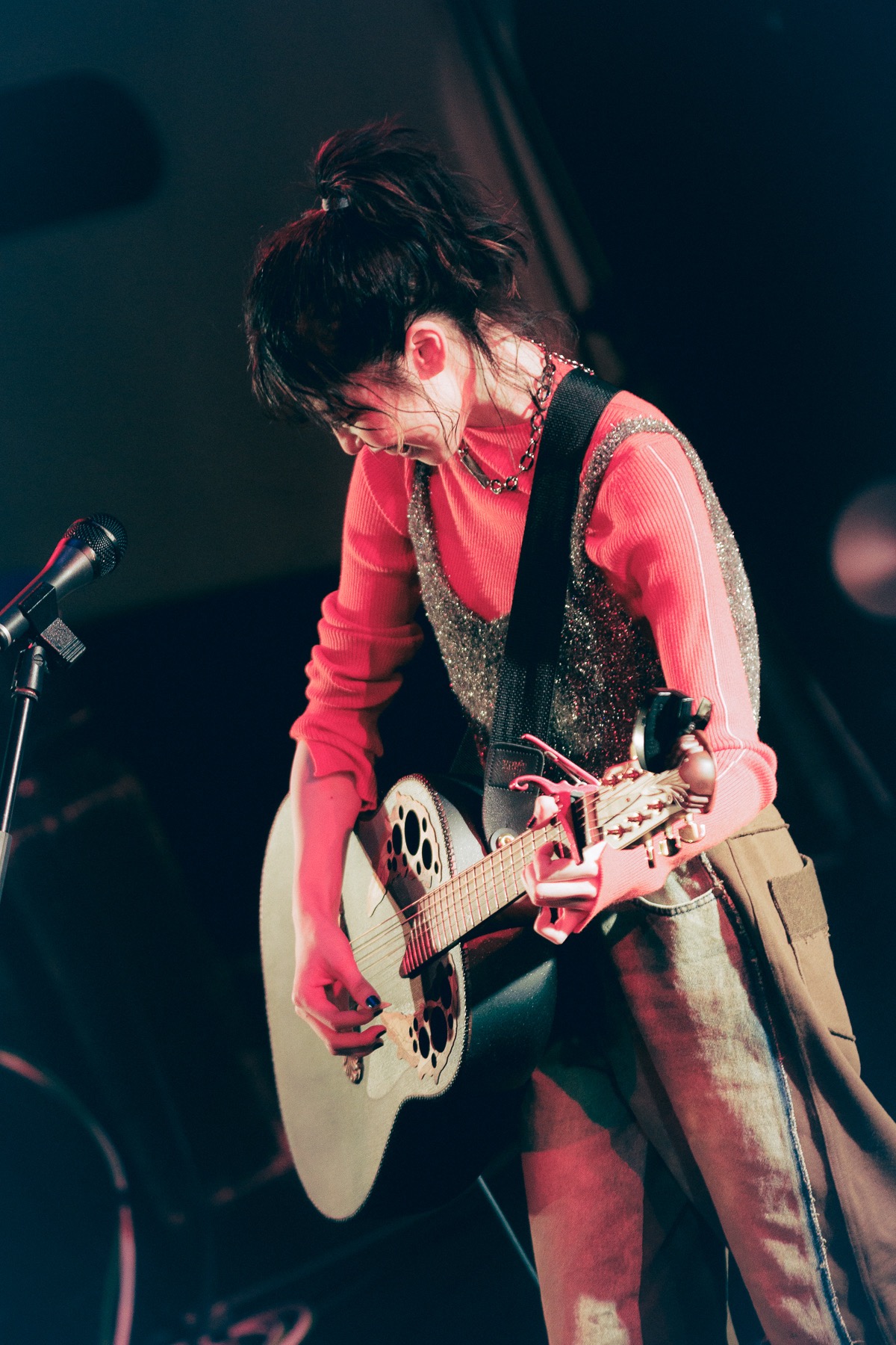 アコースティックサウンドは場内に和やかなムードをもたらし、汐は時に制作エピソードを語りながら楽曲を歌い届けた。例えば、「恋愛って1個1個終わっていくもので、今している恋愛が一番大事な人が多いと思うんですけど、今までの恋愛が無意味ということはなくて。1個1個の積み重ねが今の自分や、相手への態度、受け答えを作っているなと思いながら書いた曲です」と語られたのは「糸しいひと」。歌声の余韻がライブハウスに響く中、自分の過去に想いを馳せていた人もいたことだろう。さらに汐は、「今までは自分のことを書かないことが多かったけど、去年“この気持ちを曲にしたい”と思った出来事があって」と心境の変化を語ったあと、新曲「だんまりの中にもたんまり」を披露。シンガーソングライターとしてのあらたな芽生えを飾らずに届けると、観客はリズムに合わせて手拍子し、彼女のことを祝福した。