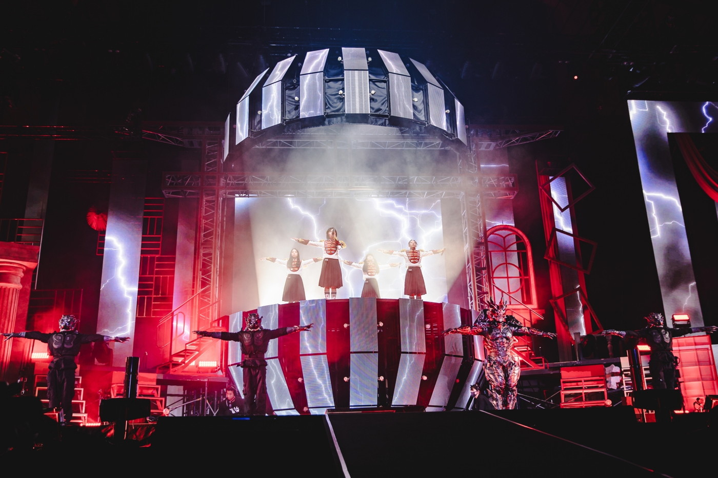 巨大な鳥居をセンターに、赤く染まったステージの左右にはホーン隊が登場。ステージ中央に設置された球体からメンバーが姿を現すと、割れんばかりの歓声が会場に響いた。