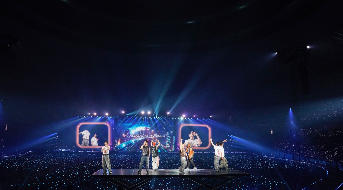そして最新アルバムからの「You got my mind」は洋画風に縦字幕の映像と女性ダンサーとのコラボでラブストーリーの世界観を表現。直後、スクリーンに流れ星が流れる。「アリーナ、スタンド、最上段の皆さん。そして配信をご覧の皆さん、誰も置いていきません。一緒に行こう!」と客席に投げかけるメンバーの姿がスクリーンに映し出されるなか、心温まるようなバラードのアレンジから始まる「R.Y.U.S.E.I.」が歌われる。輝く星々のような観客たちのライトに包まれ、いつまでも色褪せない大ヒットチューンを“今”の形で届けた。
