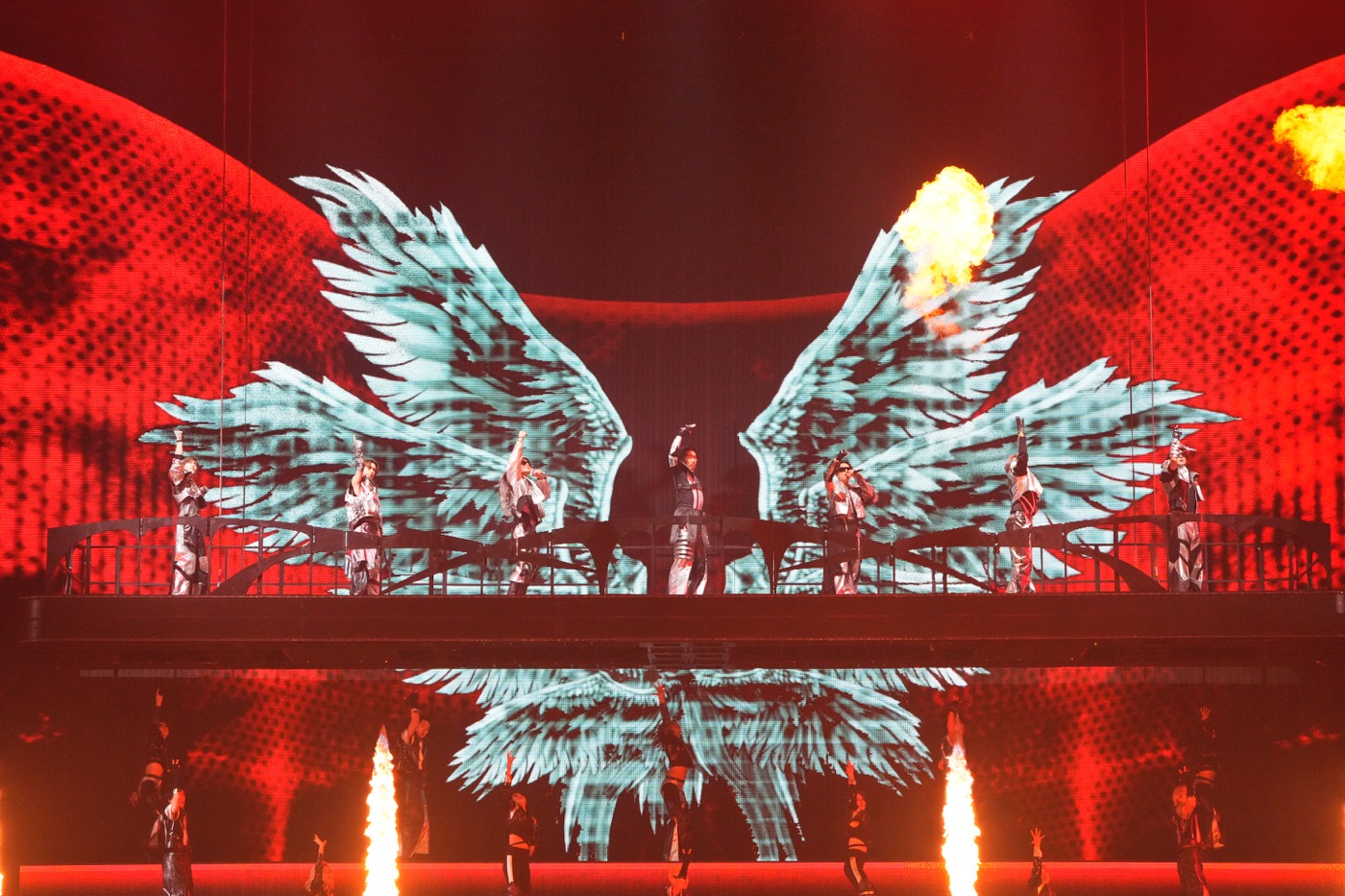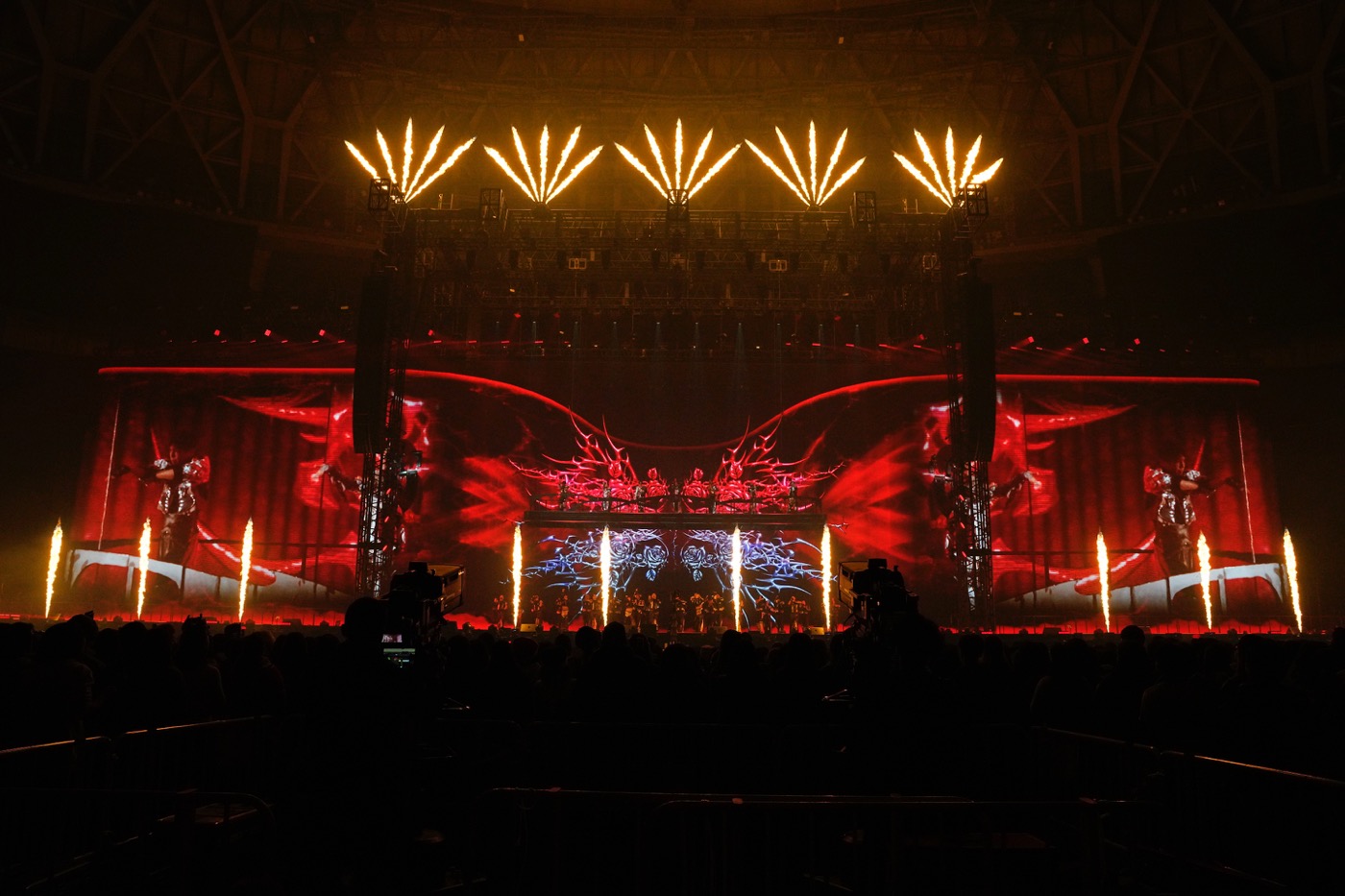 重厚なコーラスが鳴り響くなか、メンバーが多種多様な神々に扮したCG映像による壮大な世界観でライブはスタート。ステージに現れた7人が巨大スクリーンに映し出されると、たちまち歓声が響きわたり、そのまま低音が響くアッパーチューン「DEVELOP」を青いレーザーの光と炎の特攻演出とともに聴かせ、一気に会場の熱を高めた。