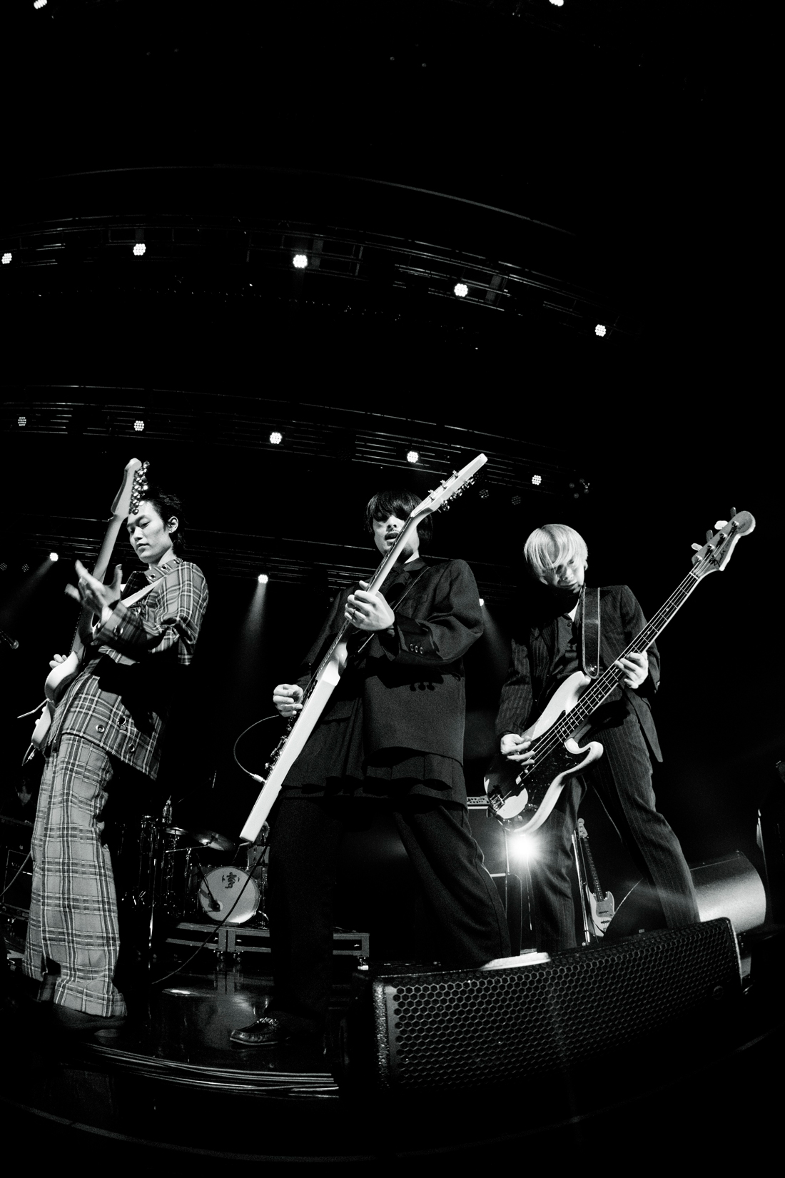 「今日はSMA50周年のイベントということで。俺たちがまだ対バンしたことがない、素敵なアーティストをお呼びしました。新宿から来たOKAMOTO’Sです!よろしく!」(ショウ)という挨拶に続き、この日、インフルエンザのために欠席したハマ・オカモト(Ba)からの手紙を朗読。「本日はMCの代わりに手紙という形で参加したいと思います」という言葉に、会場から大きな拍手が送られた。