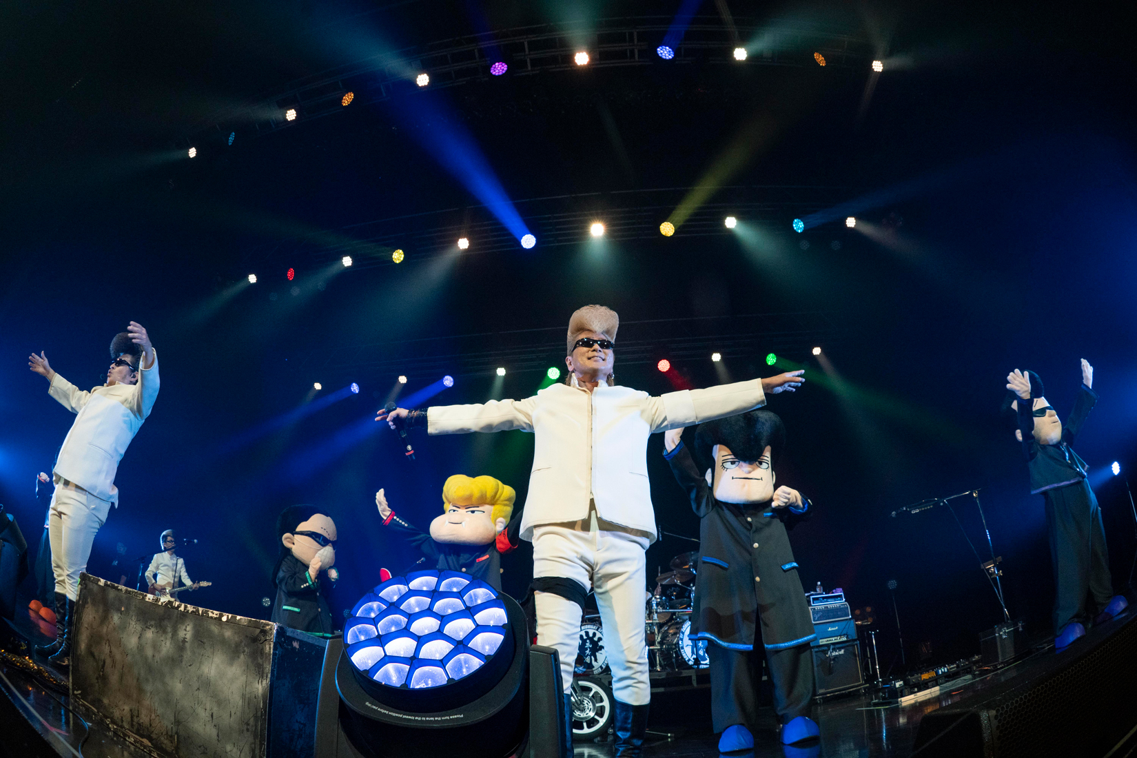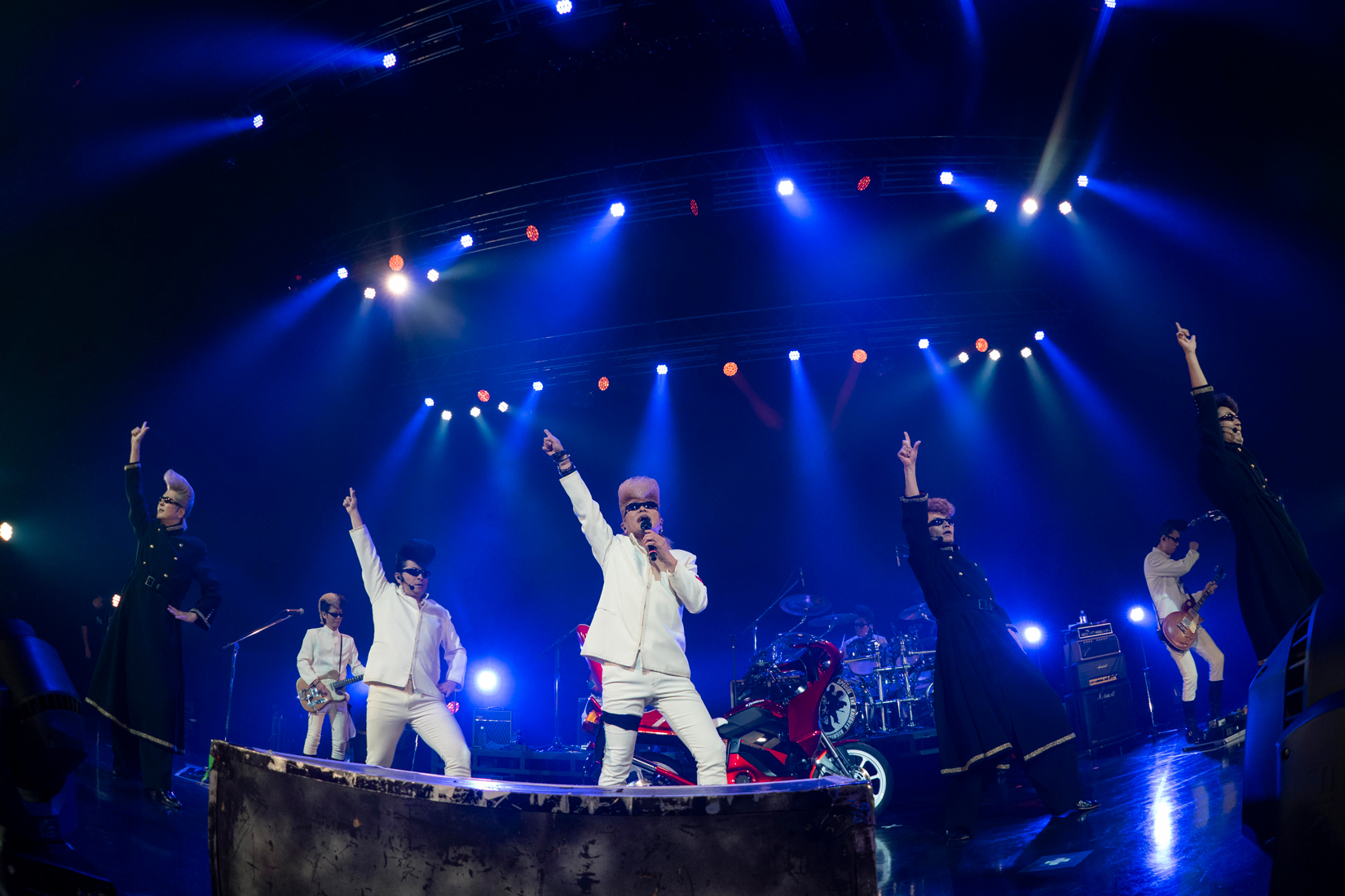 「もっともっとイケるかい!? 今夜の氣志團、全力で始めるぜ!」という煽りから「Baby Baby Baby」「スウィンギン・ニッポン」「萌え萌えROCK’N’ROLL」とロックンロール3連発。イナたくてカッコいいパフォーマンス、タイトに決まったバンドサウンド、綾小路の圧倒的なカリスマ性が響き合い、会場中が氣志團のスタイルで染まっていく。