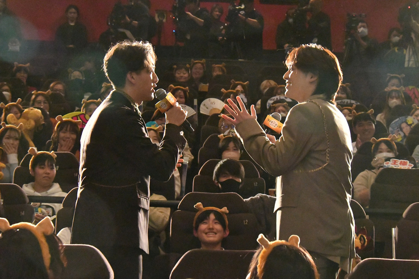 右近も「心がこもっているのが伝わってきますよね。“げんげん”は以前、誰よりもタカに寄り添ってタカに愛情があると言っていたが、本当にそのとおり。技術だけではなく、気持ちを注ぐことをやり切ったんだなと。“げんげん”の違う一面にびっくりされると思いますよ」と称賛すると、続けて、「(もう一回闇落ちボイスを聞かせていただきたいですけれども…みんなも聴きたいですよねー?」と目を輝かせ、本作のイベントでは恒例となっている“ムファぶり(=ムチャぶりの意)”を披露。