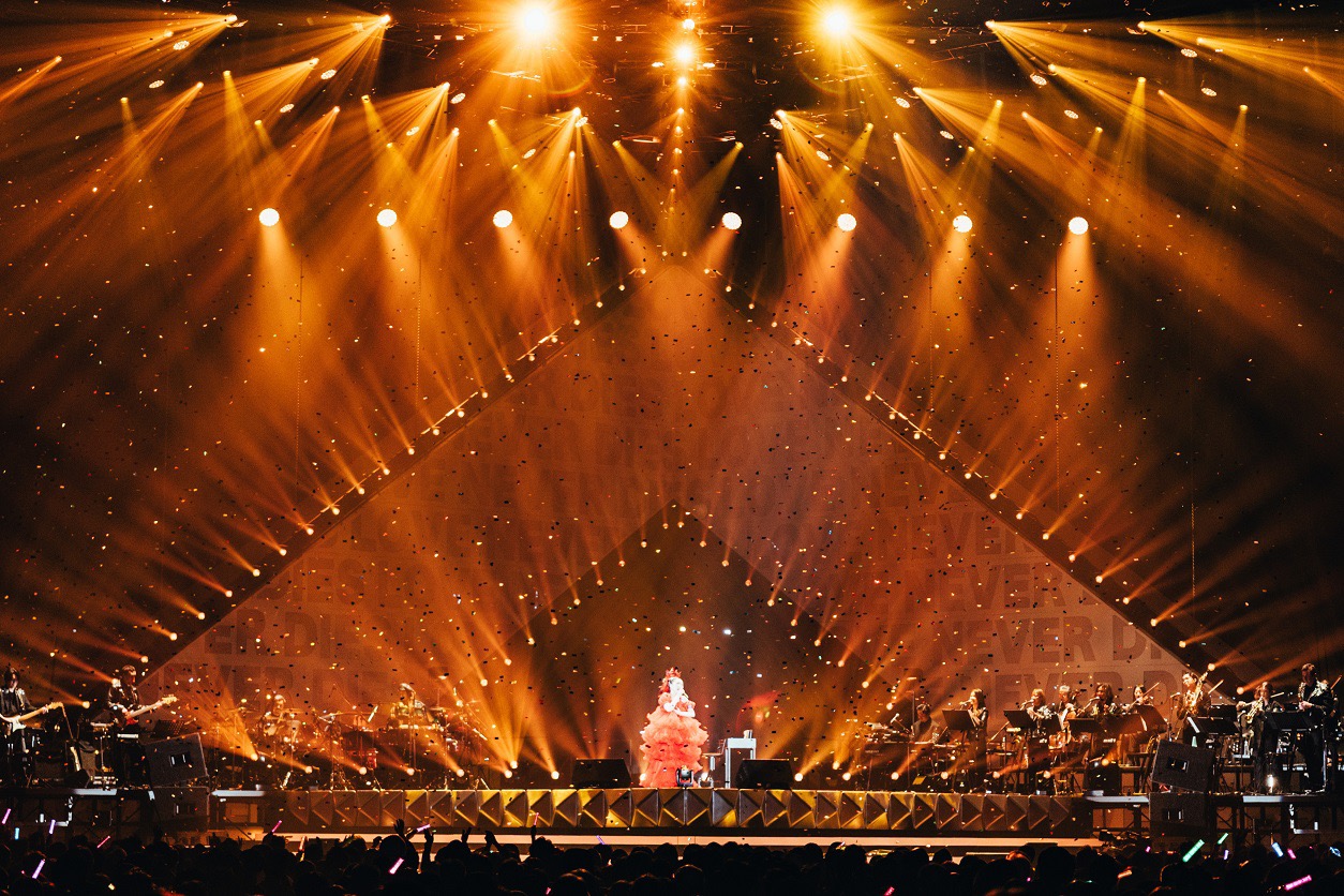 その巨大オブジェがオーケストラサウンドとレーザーによるライティングに染められると“LOVE NEVER DIES”の文字に彩られたLEDが、オブジェを中心にまるでピラミッドのように煌めく。そしてバレエダンサーたちが華麗に舞うなか、MISIAが登場。オープニングは2024年夏に開催されたパリ五輪に向けたアスリート応援ソング「フルール・ドゥ・ラ・パシオン」。