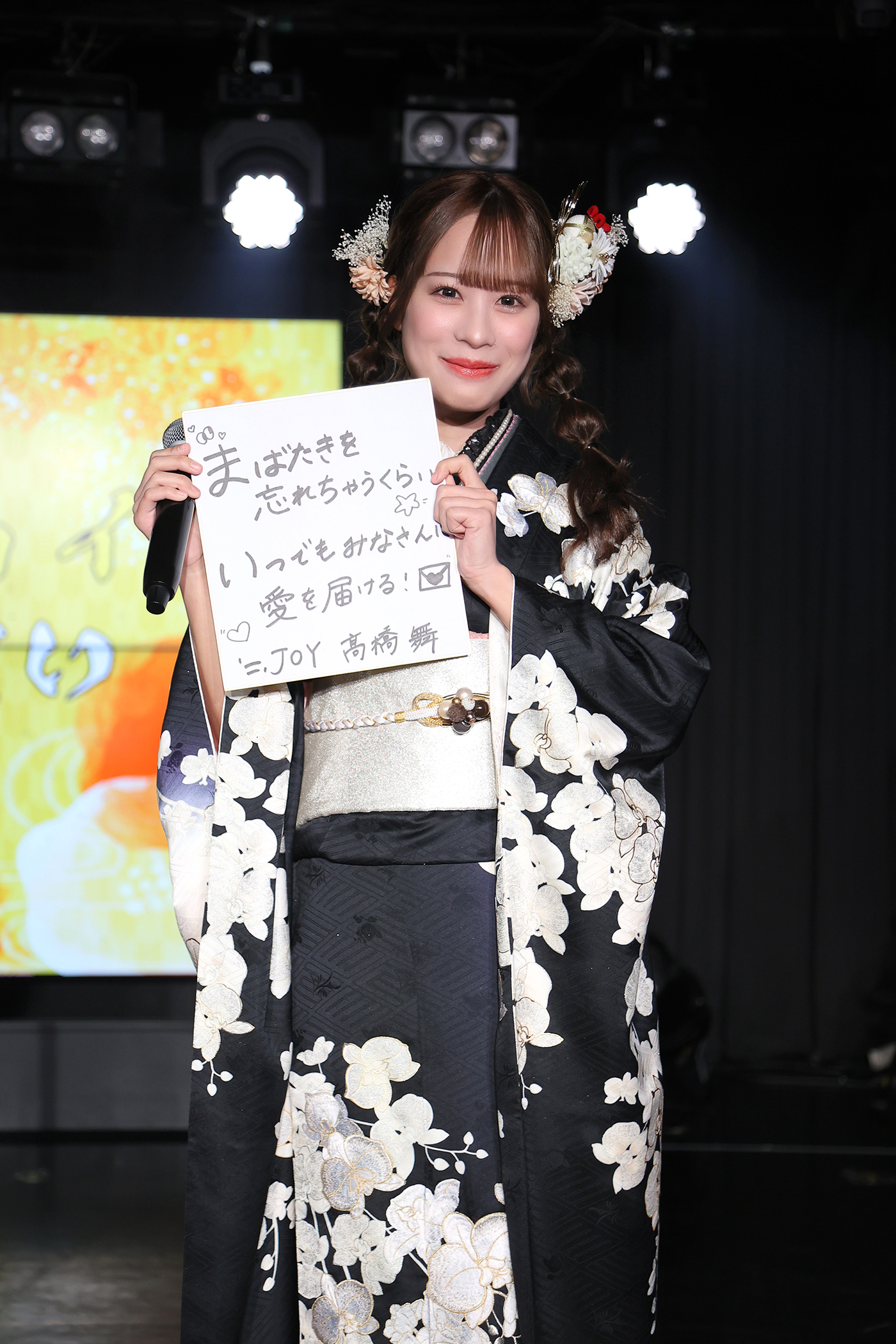 =LOVEのリーダー山本杏奈がMCを務めるなか、振袖姿の5名が抱負を、自身の名前を頭文字にした「あいうえお作文」で色紙に書いて発表した。