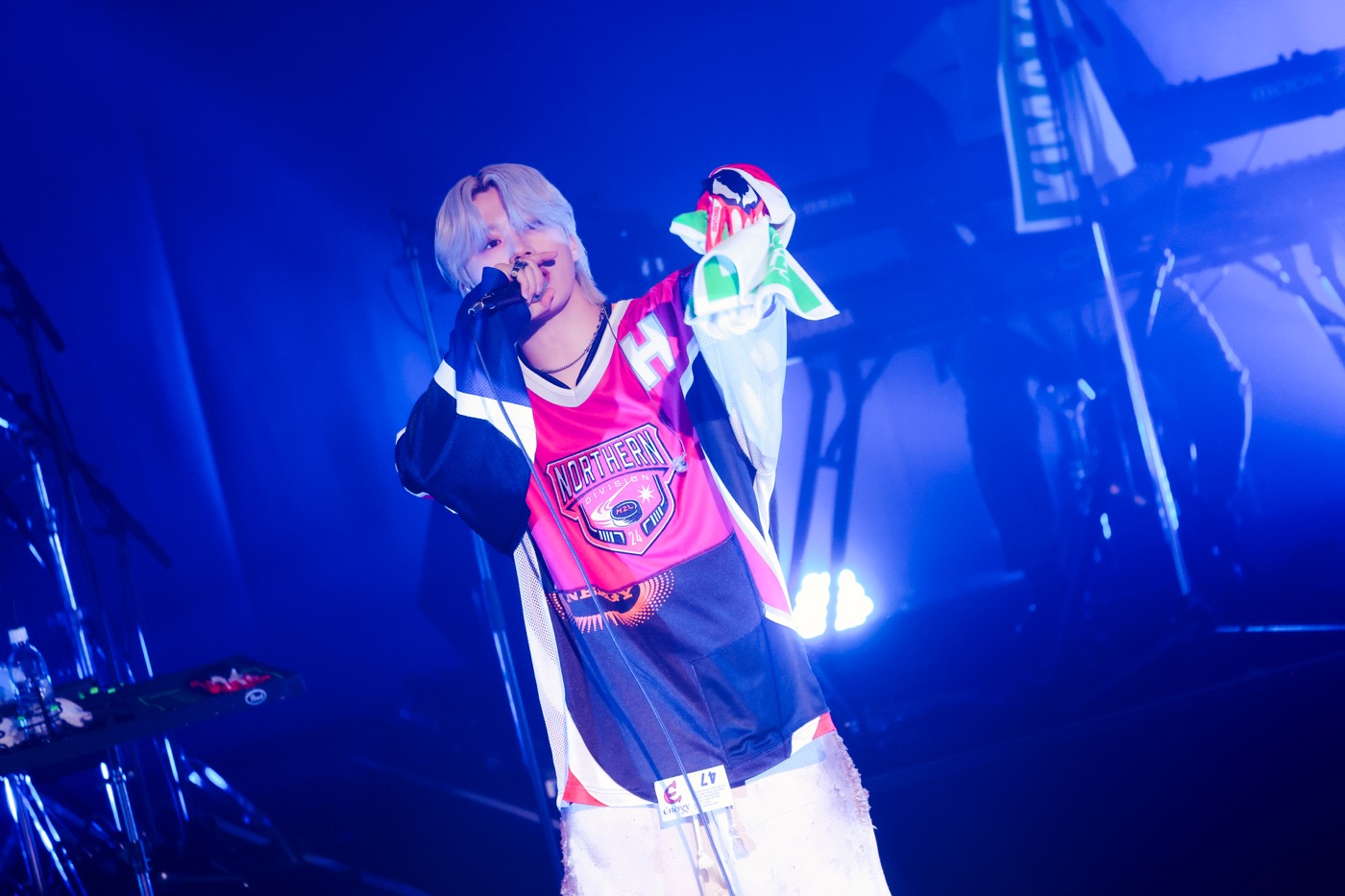 タイトルの『LOOK UP』は、ソロステージのために制作されたメイン曲の「The sky make me slow」からインスピレーションを受け考案。ステージは、そんなキーとなる1曲でスタート。メロウなラップをスタンドマイクを使ってパフォーマンスすると、独自のムードを作り上げる。今回は特技であるドラムステージに用意し、ムーディーで心地のよいビートを刻み観客を引き込んだ。