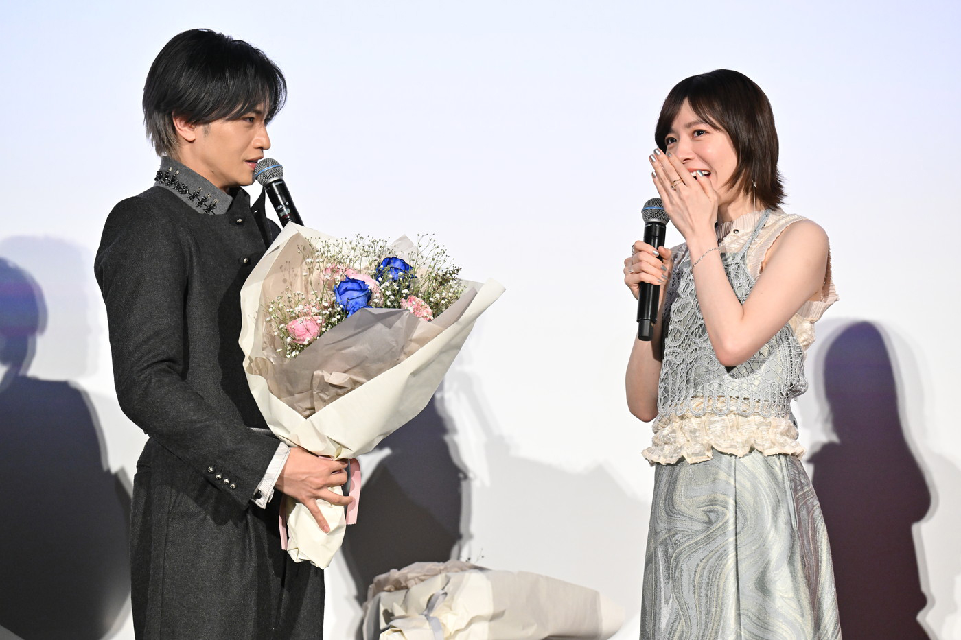 さらに、中島にサプライズで、スケジュールの都合で同舞台挨拶に参加することができなかった三木監督から中島へのプレゼントとして、花束とノートが運び込まれると、中島は「えっ!? いいんですか? 僕にも」と驚き、代表してmiletが中島へ花束を渡す流れとなっていたが、その前に自ら花束を手にしてしまった中島は「おわかりですよね。僕は花があると掴んじゃうんですよ」と言い訳をして会場の笑いを誘った。
