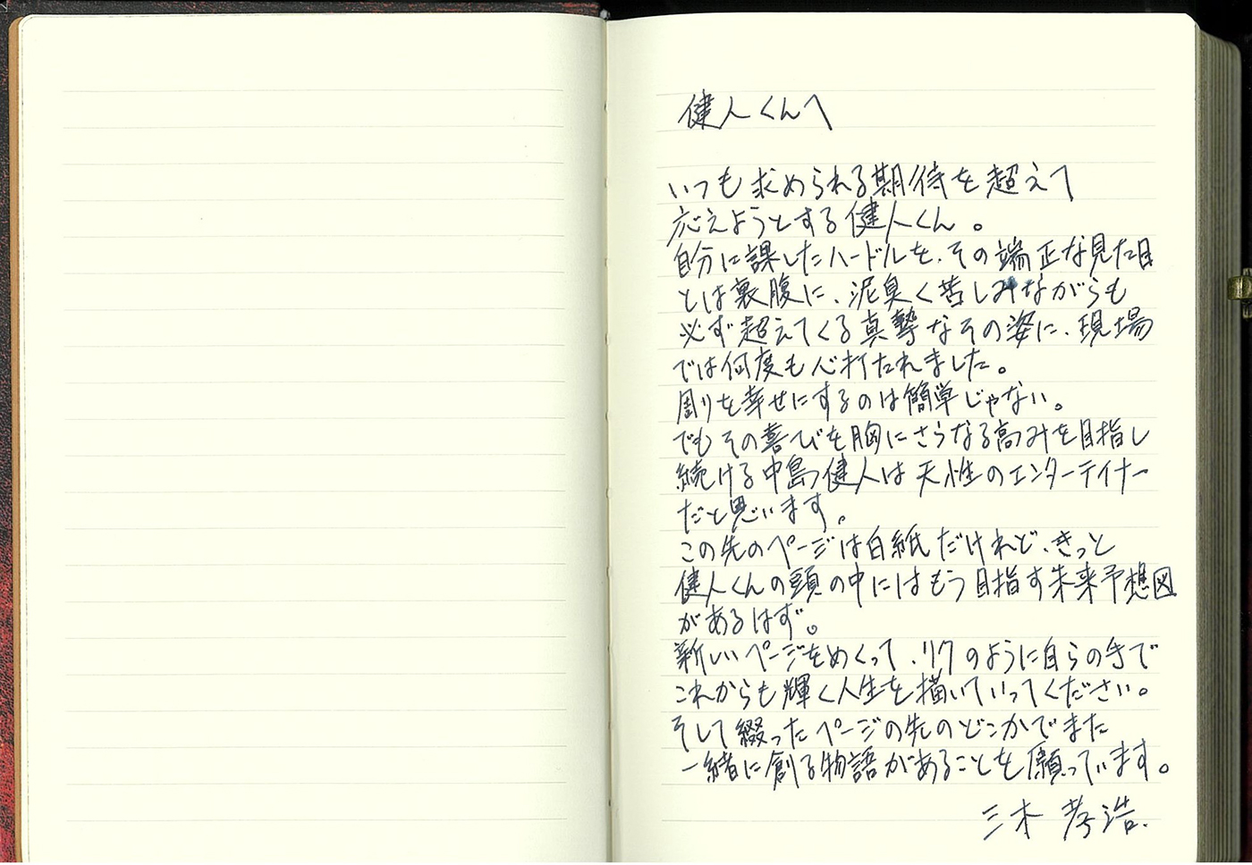 三木監督からのメッセージを受け取った中島は「胸いっぱいです。ありがとうございます。劇中でも本当に大切なアイテムですし、このノートに何度も思いを馳せてリクというフィルターを通して物語を歩んでいました。なので、このノートに僕が尊敬する三木監督のメッセージをしっかりと書いていただき、ここで聞けたことに最上の幸せを感じています。本当に皆さまありがとうございます」と感無量な表情を浮かべ、会場から温かい拍手を浴びた。