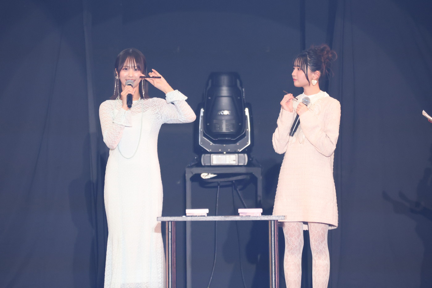 また、15周年を迎えた益若つばさがプロデュースするアイメイクブランド「ドーリーウインク」について、尾木波菜は「“ピュアカラーアイシャドウ”はラメが大粒でキラキラしているのでライブで使用するのが楽しみです!」と語り、市原愛弓は“オーバルマルチジェルライナー”について、「ジェルライナーなのでスルスルと描けて、普段使いもしやすいと思います!」と呼びかけた。