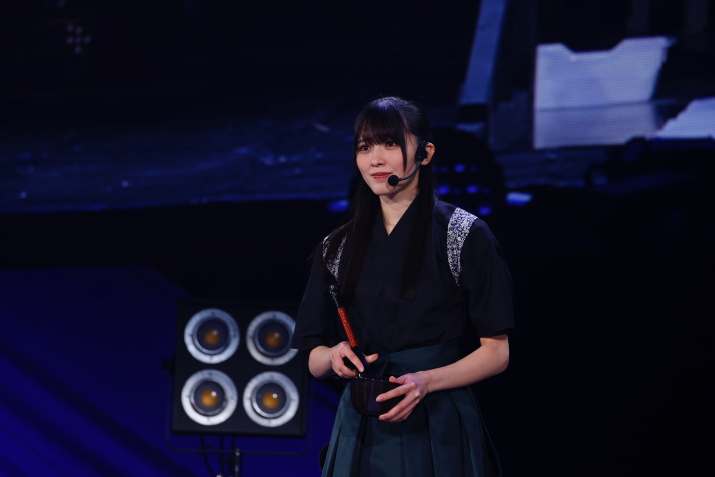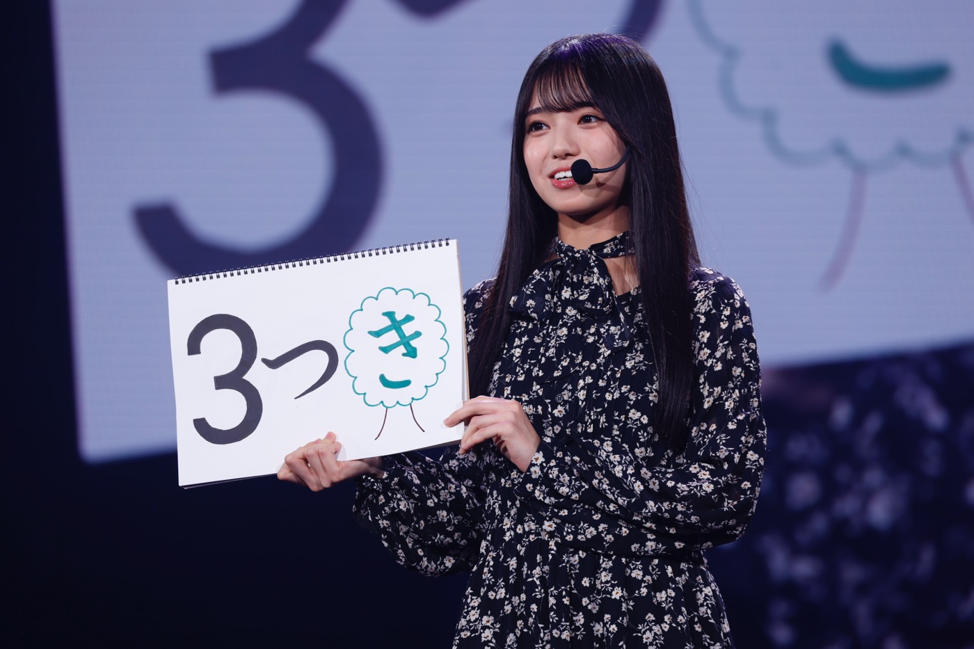 「あかりと一緒に海行かへん?」と関西弁で誘うと、客席は全力で「いいよー!」と返した東京都出身の川端晃菜は、「2011年生まれ。乃木坂46と同い年です。5歳で出会ってからは乃木坂46一色の日々でした」と話し、自身のプライベート写真を公開。「サヨナラの意味」のMVに登場する“棘人”(しじん)の真似をしたものや、映画『あさひなぐ』のポスターに写る西野七瀬の真似をするものなどで、グループ愛を見せつけた。
