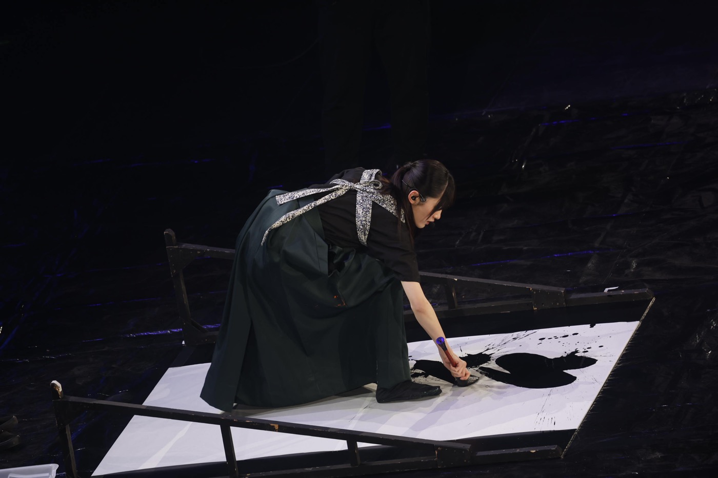 大越は、4歳から習っていた書道の腕を見せつける。大きな半紙に大きな筆で書く書道パフォーマンスを「ヤー!」と叫びながら披露。「舞」と書いた大越は、「タイムリミット片想い」に何度も出てくる言葉と説明した。自己評価は「100点中6点」だという。