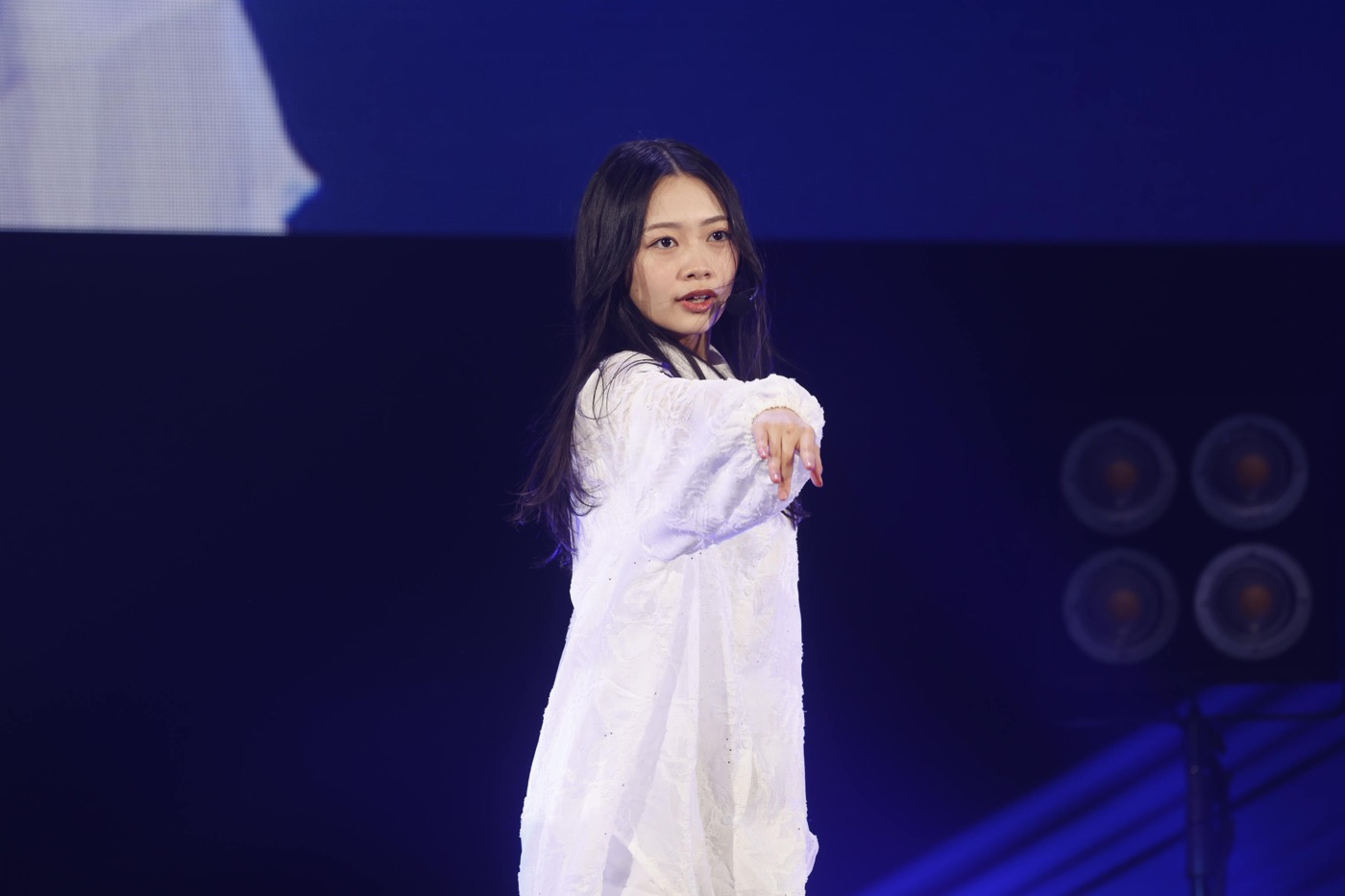 さらに、新体操を9年間経験してきたそうで、両手を後ろに組んだまま前に持ってくる特技を披露した。東京都出身の小津玲奈は、「“小津の魔法使い”になり切って、会場に魔法をかけたいと思います!」と宣言するや、杖を振り、会場をペンライトで紫一色に染めてみせた。「笑い声が魔女みたいと言われるので、たくさん笑っていきたいです」と抱負を語った。
