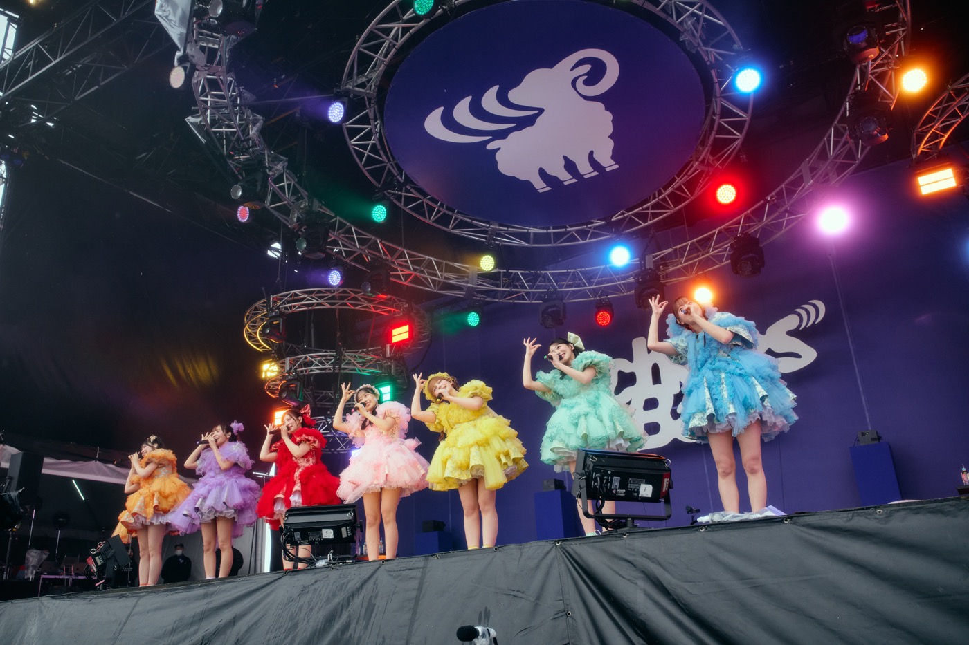 Day2のトップバッターとしてメインステージに登場したのは、スペシャルゲストのFRUITS ZIPPER。あいにくの小雨模様ながら、超満員のオーディエンスの拍手と歓声に迎えられた7人が、「NEW KAWAII」で賑やかに派手やかにDay2の幕を開ける。メンバー紹介ソングの「うぇるかむとぅ〜ざ♡ふるっぱー!」、ライブ定番曲の「ぴゅあいんざわーるど」と続き、“かわいい”を存分に振りまくと、MCでは8月にさいたまスーパーアリーナで3周年記念ライブを行うことを告知。ラストは代表曲「わたしの一番かわいいところ」で、オーディエンスの心を撃ち抜いた。