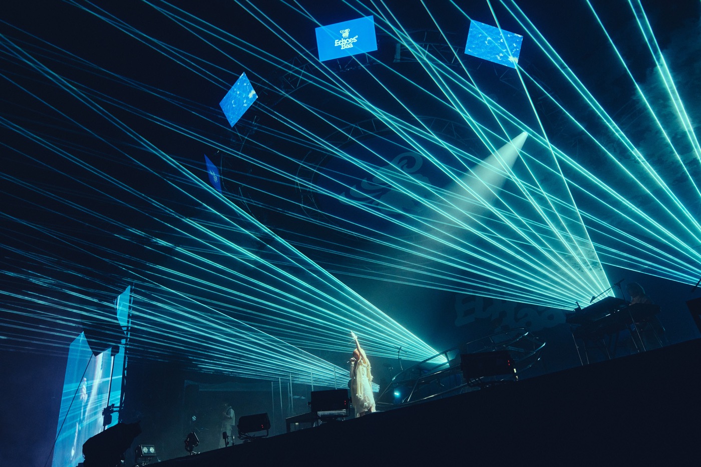 そして、2日間に渡って開催された「Echoes Baa」のアクトもいよいよラスト。陽の落ちた会場に響くオーディエンスの大歓声に迎えられ、ステージに登場したYOASOBI。派手やかなライティングに照らされて歌う姿が神々しくさえ見えた「アイドル」でライブの幕を開けると、「Echoes Baaラストのステージ、全員で全力で楽しんでいきましょう!」とikuraが力強く告げる。新曲ながら会場中がクラップや歌声を合わせた「PLAYERS」、みんながスマホの光を掲げて心繋いだ「優しい彗星」とたくさんの魅せ場を作った中盤を経てのMCで、「日本の音楽は世界に絶対届いてる。もっと誇ったほうがいい!」と熱く語ったAyase。「祝福」では横浜港に花火が上がり、“花火と音楽のコラボレーション”という凄まじすぎる演出が施され、オーディエンスのボルテージは最高潮。ラストは会場中が歌声を重ねた「群青」の大合唱で、「Echoes Baa」は美しすぎるエンディングを迎えた。