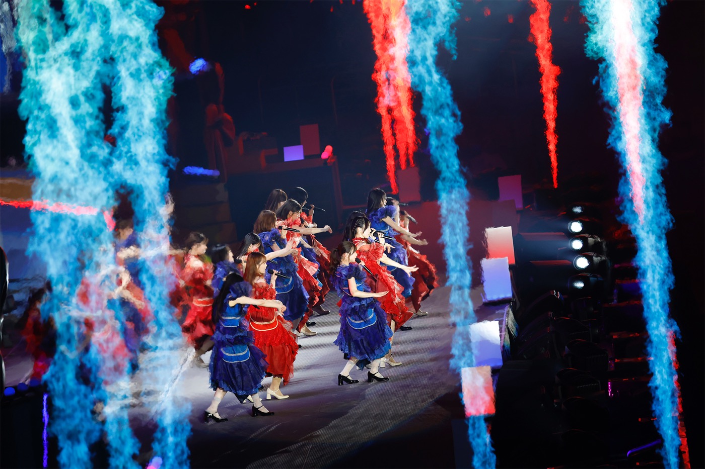 怒涛のメドレーを完遂したあとは、13歳の誕生日をお祝いする「Happy Birthday to You」の合唱を経て、遠藤や中西を中心とする青組、賀喜や井上を筆頭とした赤組の2チームに分かれてパフォーマンスに挑む。それぞれのチームカラーの衣装を身にまとい、青組は「Actually…」「ごめんねFingers crossed」、赤組は「おひとりさま天国」「I see…」と、月と太陽をイメージさせる対照的な選曲とパフォーマンスを見せる。