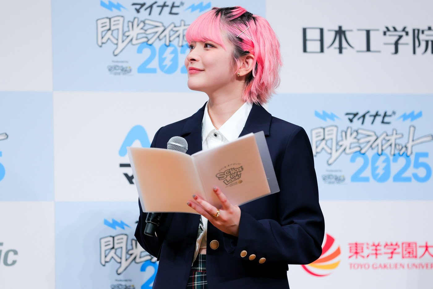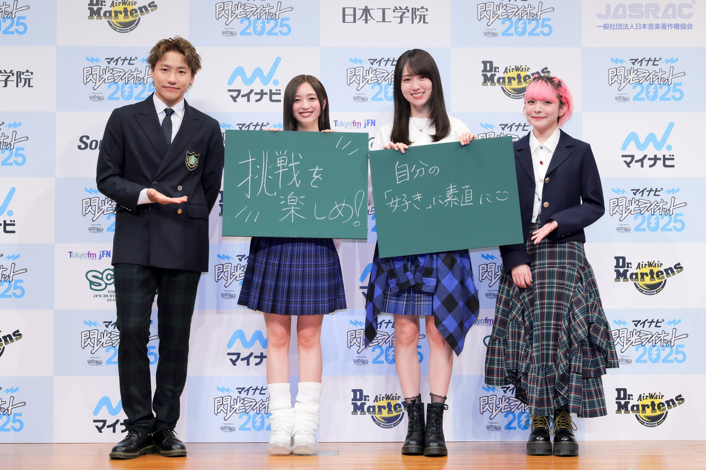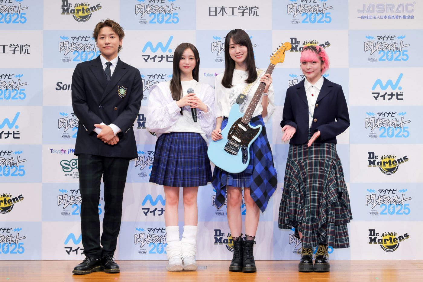 そして、今年の応援アンバサダーは、閃光ライオットの歴史上初めてのふたりであることが発表され、こもり校長の呼びかけで乃木坂46の賀喜遥香と井上和が登場。ふたりとも爽やかな制服姿に身を包み、賀喜は『マイナビ 閃光ライオット 2025』のアイコンであるギターを抱えている。