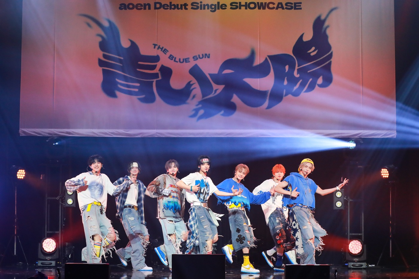 デビューショーケース冒頭では、デビューシングル「青い太陽 (The Blue Sun)」収録曲の「Blue Flame」を披露。昼とは対照的な夜の暗闇の中でも情熱的に燃える心の中の青い炎を表現した楽曲で、aoenのパワフルなパフォーマンスが光る一曲だ。