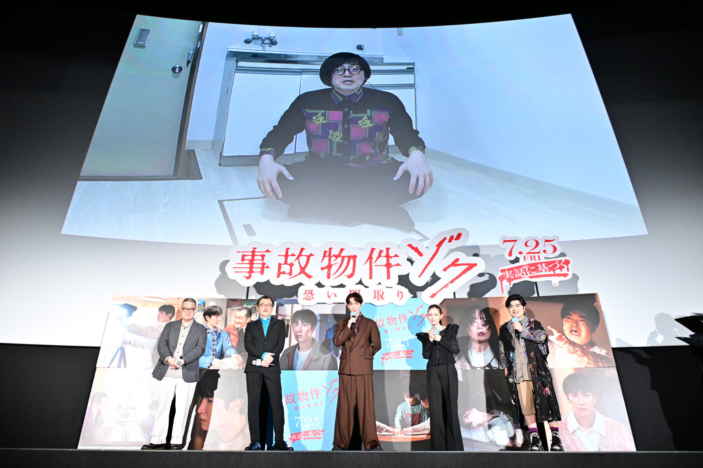最後に「渡辺さん演じるヤヒロの性格が事故物件に住むセンス抜群。畑さんのシーンもすごく恐くてゾクッとしました。小道具や装飾とかもスタッフがこだわっていらっしゃったので細かいところも観ていただいて、何度でもゾクッとしていただきたいです」と、原作者である松原も本編を楽しんだ様子で魅力を存分に語ったのち、「それでは皆さまありがとうございました」と挨拶があった瞬間、映像にノイズが走り、会場が突如暗転!
