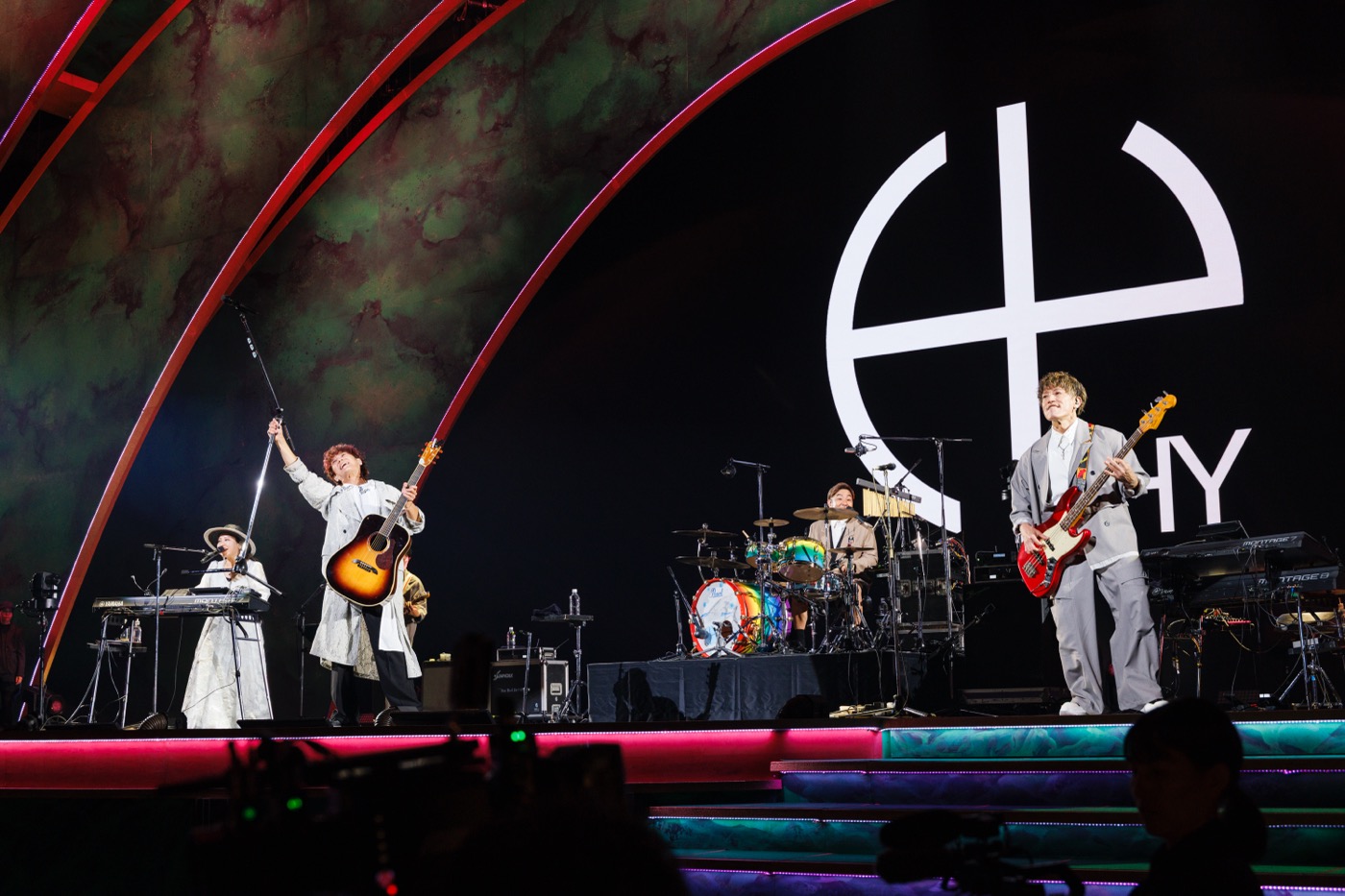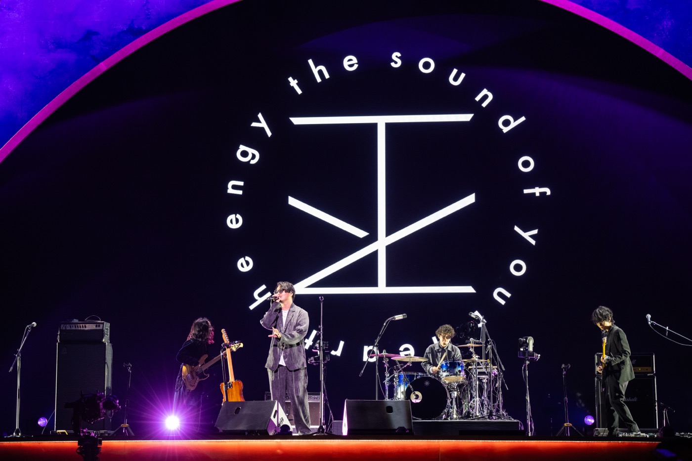 トップバッターは、HYの仲宗根泉と許田信介から紹介を受けた京都出身の4人組the engy。フロントマン山路洸至は「緊張して浮き足立ってしまっているんですけど、お祝いの祭典ということで、浮き足立った足が棒になって倒れるまで踊っていきたいと思っています」と語っていたが、そのとおり、力強いリズムと深みのある歌声に、気持ちよさそうに体を揺らすオーディエンスが続出した。